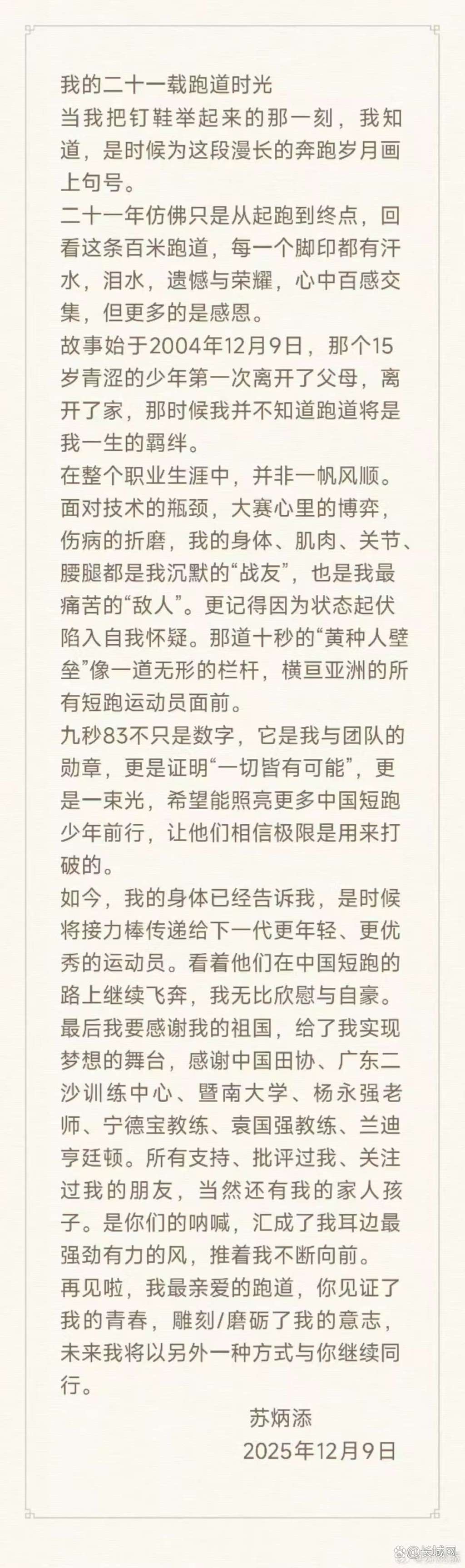 当日,苏炳添在其实名微博发表题为“我的二十一载跑道时光”的长文,他写道:“二十一年仿佛只是从起跑到终点,回看这条百米跑道,每一个脚印都有汗水,泪水,遗憾与荣耀,心中百感交集,但更多的是感恩。”