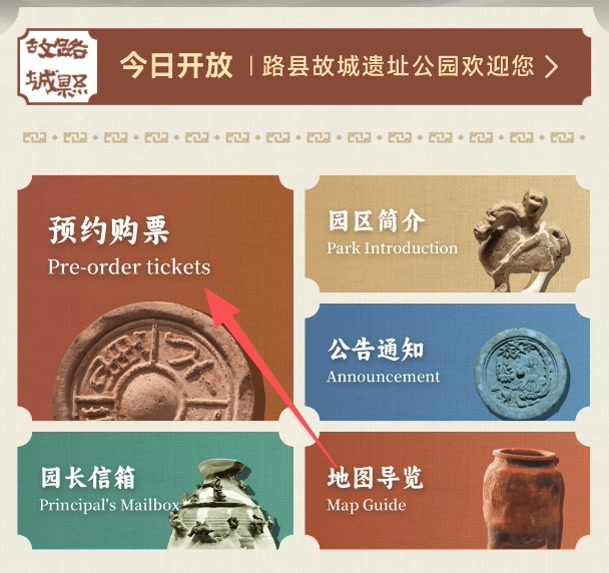 方式二:关注“路县故城遗址公园”公众号,点击下方“游.路县”→“线上购票”进行购买。