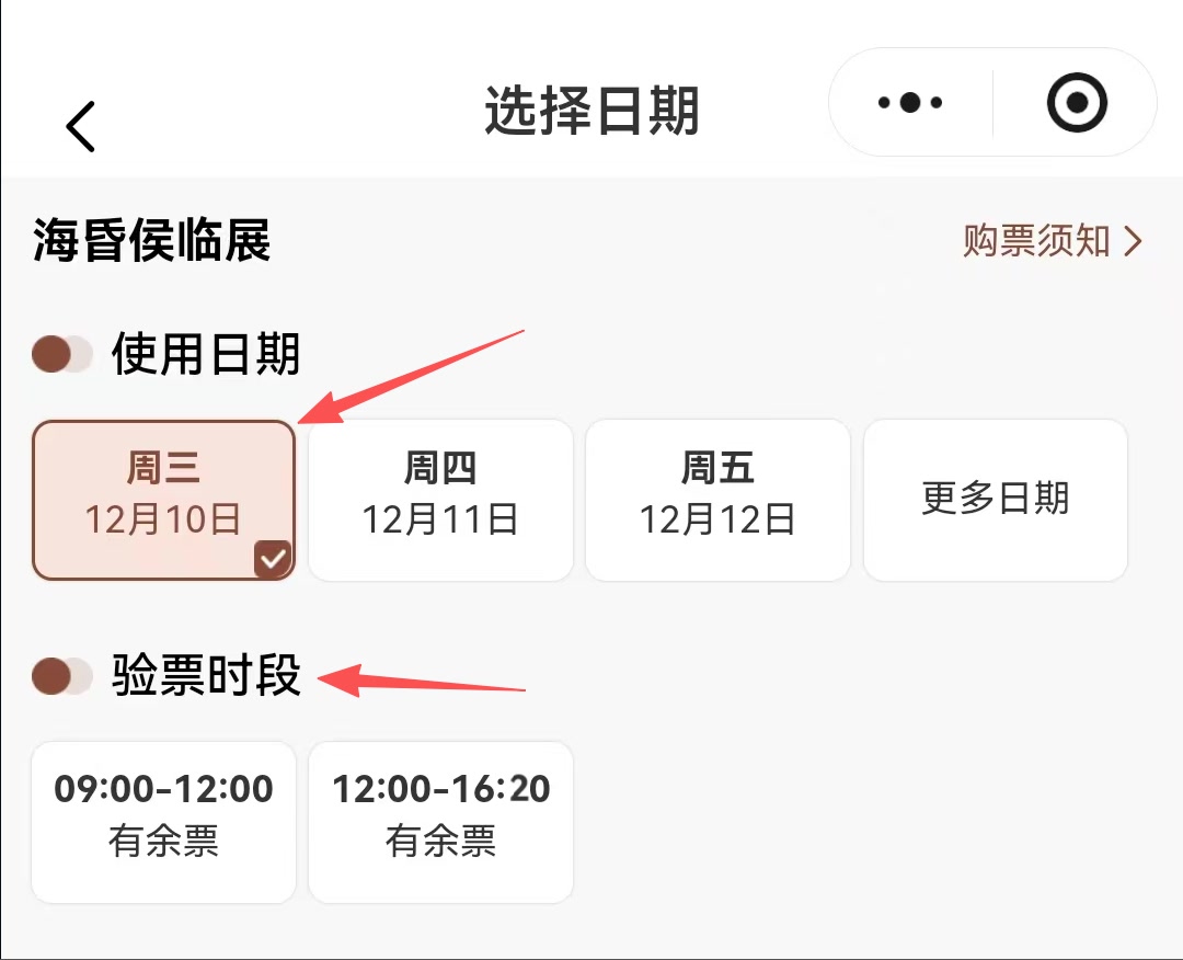 第三步:门票仅限“使用日期”当天使用,请根据实际情况选择参观日期和时段