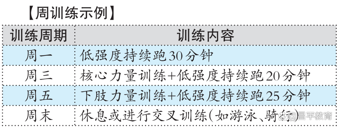 低强度持续跑:考生要以能够边跑边交谈的强度进行慢跑,每次跑20至30分钟,每周跑2至3次。这一训练内容重点在于逐步增加跑步时间和距离,不追求速度。