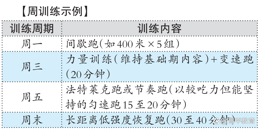 此阶段的训练目标是提升心肺功能和基础耐力,为后续高强度训练打下坚实基础。这一阶段,考生要初步适应跑步节奏,强化核心与下肢力量。