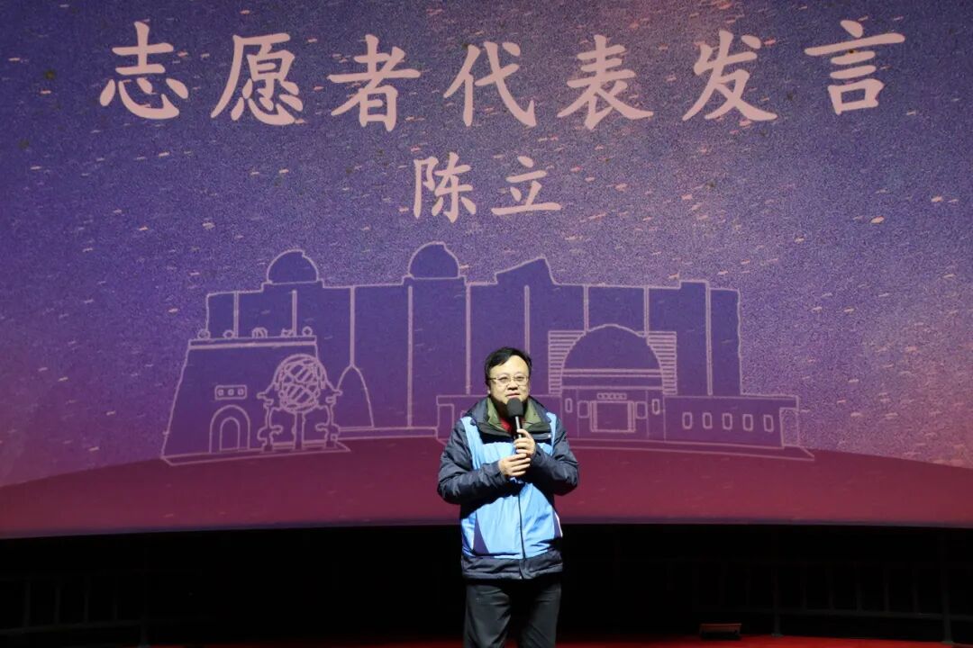 北京天文馆副馆长杨斌在致辞中,代表天文馆全体同仁向所有志愿者致以诚挚的问候与感谢。他表示,志愿者们是“文明的传播者、温暖的守护者、创意的激发者”,正是他们的无私奉献,让天文馆从一个专业殿堂,转变为充满人文温度的公共文化家园。杨馆长充分肯定了过去一年志愿者团队在规模拓展、服务提升、管理规范等方面取得的显著成绩,并鼓励大家再接再厉,共同打造更闪亮的志愿服务品牌。