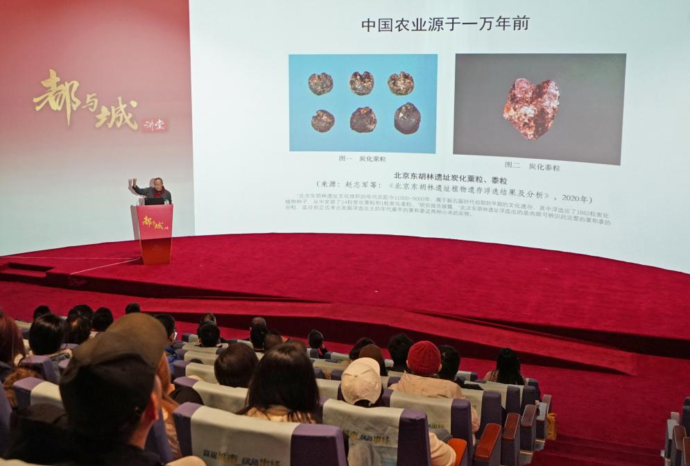 讲座首先从考古发现与农作物驯化入手,通过重要遗址,阐释中国所在地区在一万年前后率先完成农作物驯化,人类生产方式由采集向农耕转变,时间从此成为决定文明成败的关键变量。二是以“立表测影”为例,深入讲解中国先民如何通过观测日影、斗转星移,形成以二十四节气、方位与星宿为核心的时间—空间体系,“中”不再只是文字,而是通过立表测影确定方向与节气的工具,逐步上升为“建极、居中而治”的制度象征。三是结合中轴线、坛庙布局与城廓形态,系统解析北京老城如何在城市尺度上呈现这套时空观,从钟鼓楼至永定门的中轴线,以及与之等长的若干轴线,与春夏秋冬、天地四时、礼制空间相呼应,使北京成为集宇宙观、政治秩序与日常生活于一体的“中字型”都城典范。