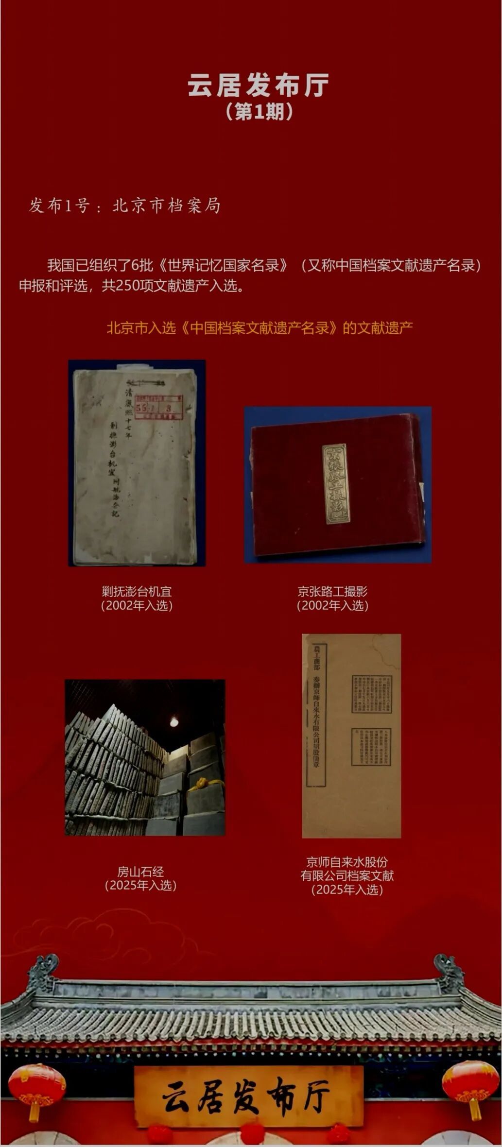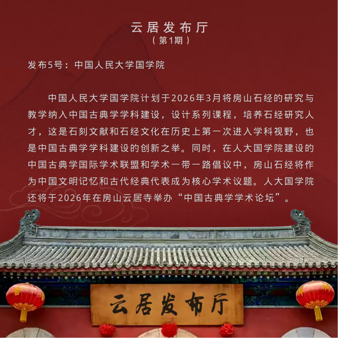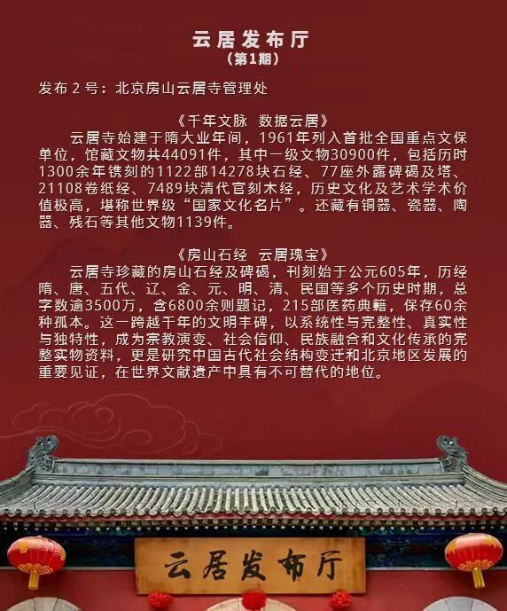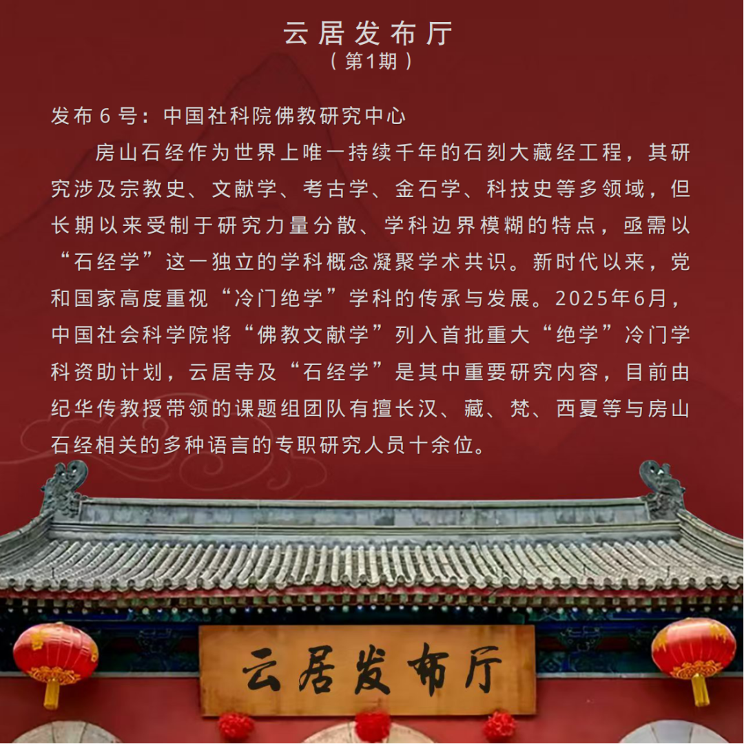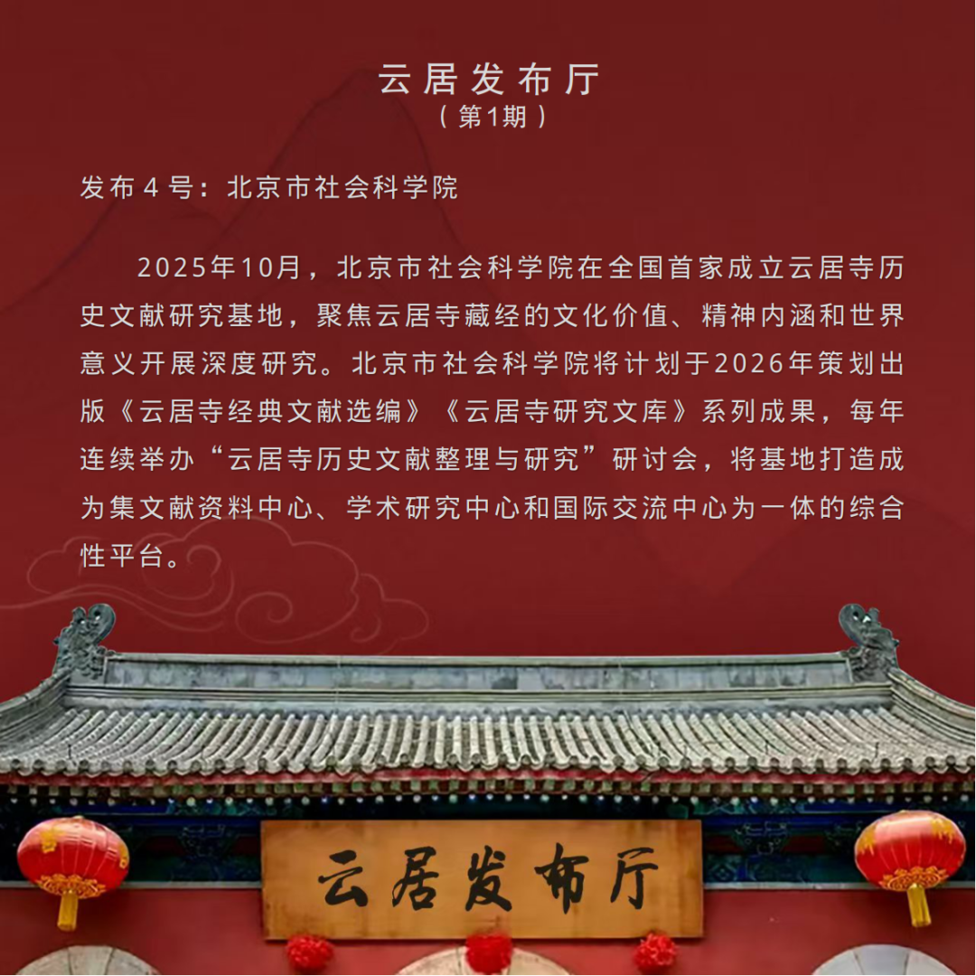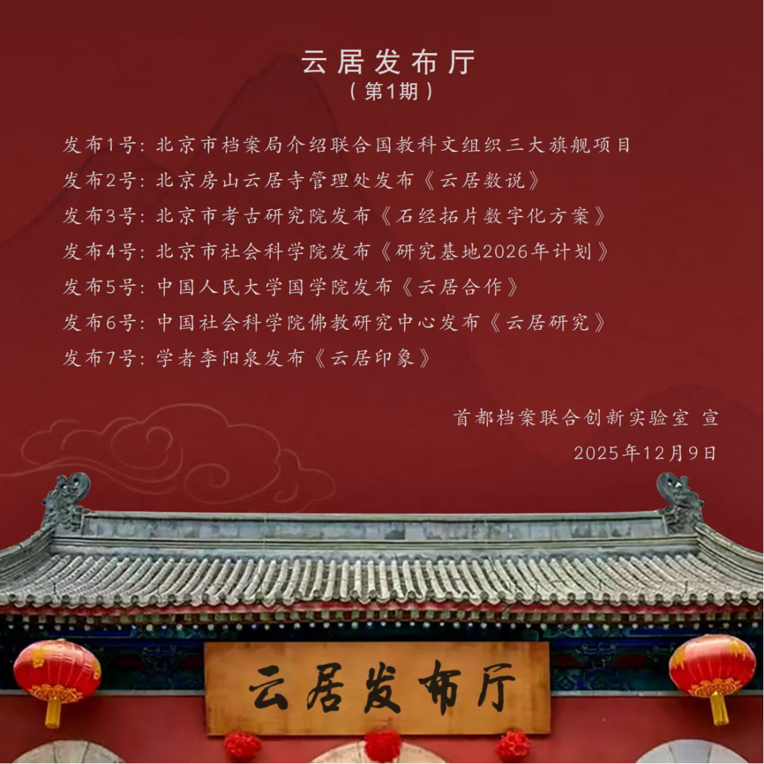 《云居发布厅》栏目由首都档案联合创新实验室发起、与微博公司联合打造,于2025年12月9日推出首期内容,此后以每月9日定期发布为主,结合实际需求适时增开不定期专场。栏目内容涵盖最新政策解读、申忆进展通报、科研成果分享、学者观点摘编、资源链接通报等板块,并设置文化爱好者互动专区,旨在深度挖掘、传承千年文明瑰宝的文化价值与精神内涵,推动其世界意义的国际传播。欣逢盛事,与有荣焉!