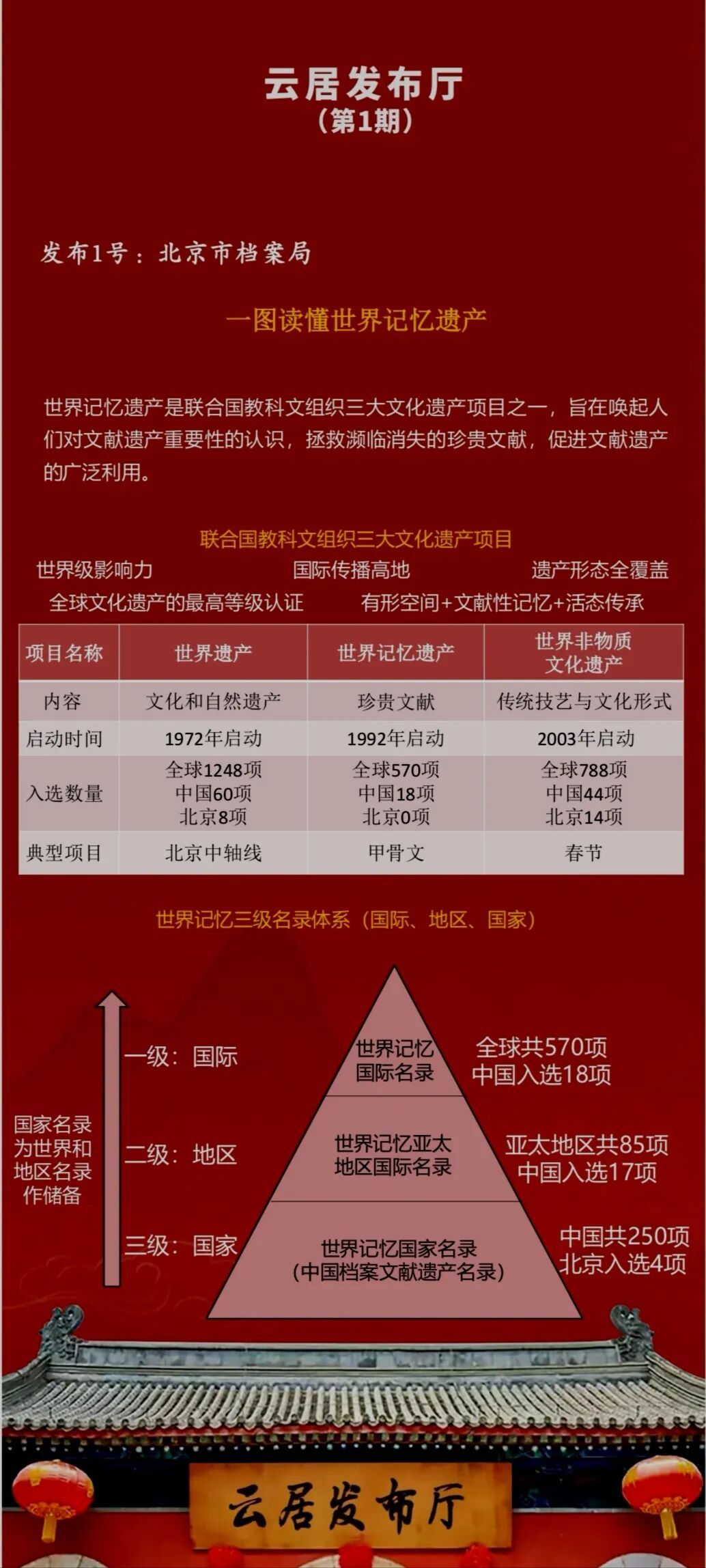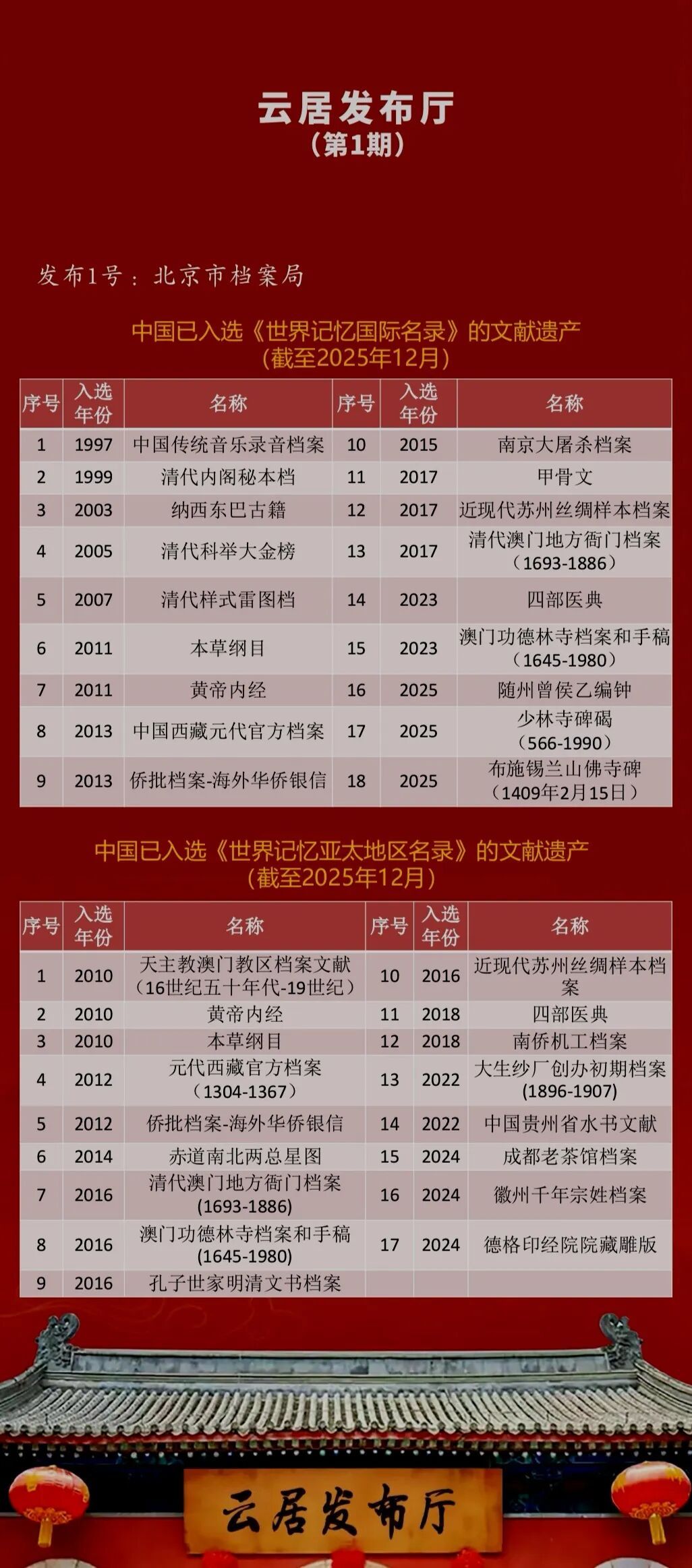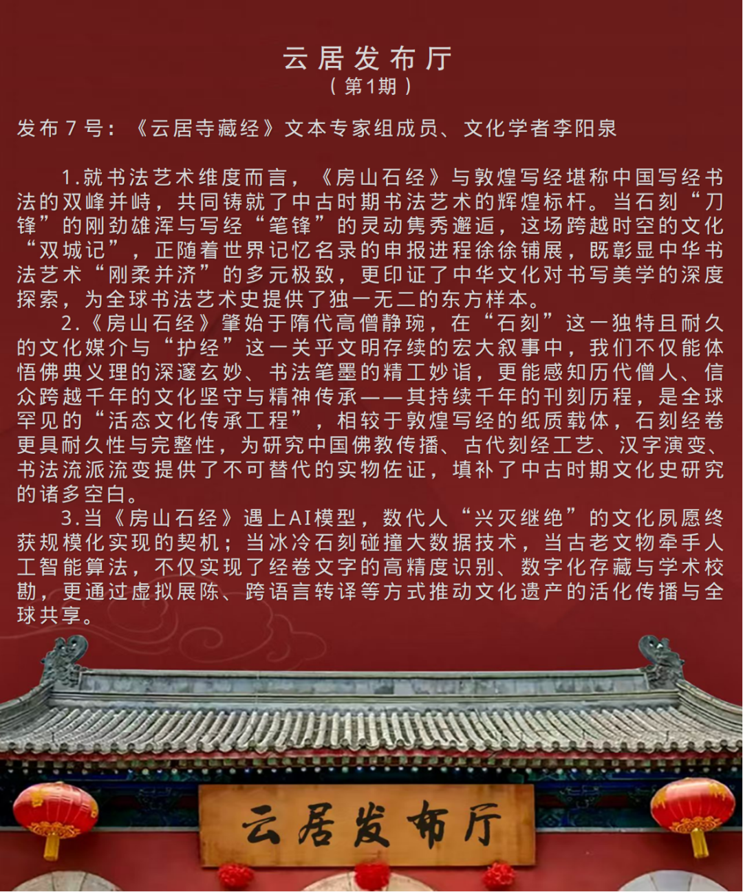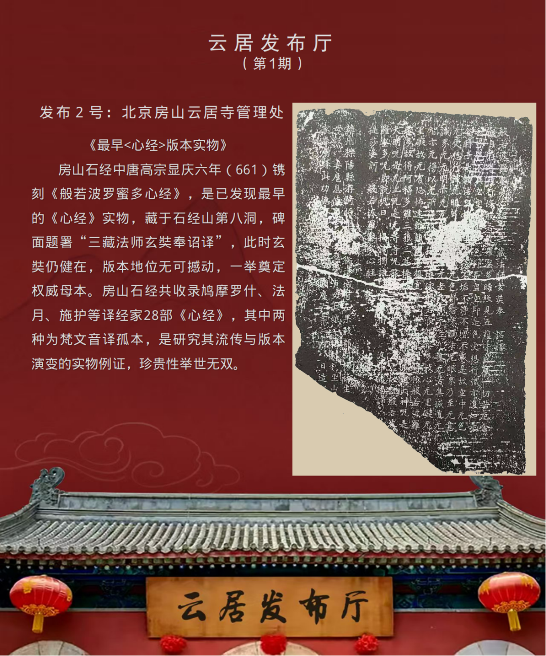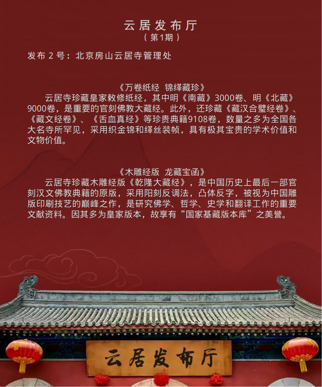 《云居发布厅》栏目由首都档案联合创新实验室发起、与微博公司联合打造,于2025年12月9日推出首期内容,此后以每月9日定期发布为主,结合实际需求适时增开不定期专场。栏目内容涵盖最新政策解读、申忆进展通报、科研成果分享、学者观点摘编、资源链接通报等板块,并设置文化爱好者互动专区,旨在深度挖掘、传承千年文明瑰宝的文化价值与精神内涵,推动其世界意义的国际传播。欣逢盛事,与有荣焉!