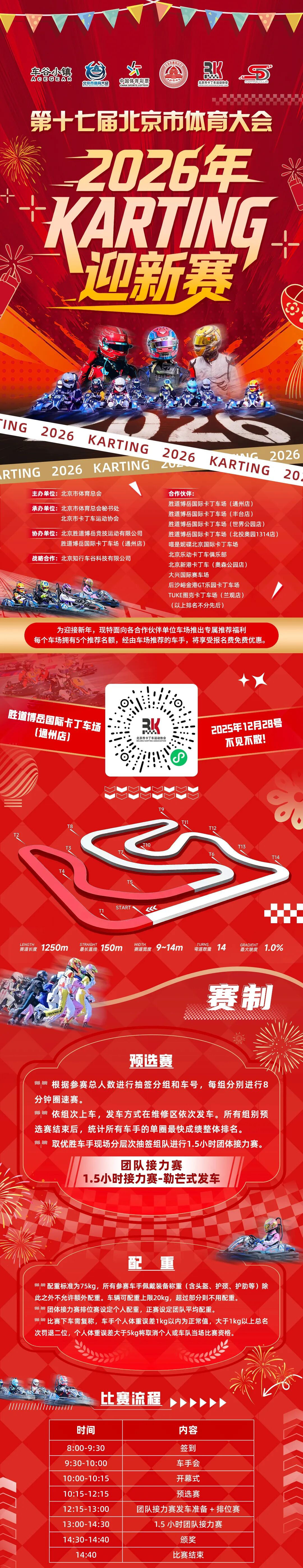 为喜迎2026年新年,深入推动全民健身国家战略与体育产业高质量发展深度融合,一场以速度与激情点燃岁末的运动盛宴即将拉开帷幕。由北京市体育总会主办,北京市体育总会秘书处、北京市卡丁车运动协会承办,北京胜道博岳竞技运动有限公司、胜道博岳国际卡丁车场(通州店)协办的“第十七届北京市体育大会 2026年Karting迎新赛”,将于12月28日在胜道博岳国际卡丁车场(通州店)举办。赛事以“竞速迎新,协作共赢”为主题,旨在以昂扬的体育精神开启新年气象,为广大爱好者打造一个兼具专业竞技、大众参与和团队协作的卓越平台。