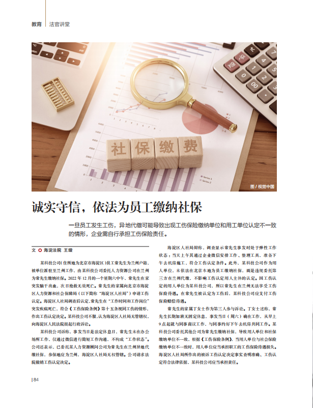 法官提醒,企业应依法在注册地为员工缴纳社保,避免委托第三方异地代缴导致关系混乱。委托第三方代缴职工社会保险是违法行为。一旦员工发生工伤,异地代缴可能导致出现工伤保险缴纳单位和用工单位认定不一致的情形,企业需自行承担工伤保险责任。诚实守信、依法为员工缴纳社保才是避免纠纷的根本。同时,员工在休息日处理工作事务时,注意保留证据(如聊天记录、邮件),以保障自身权益。