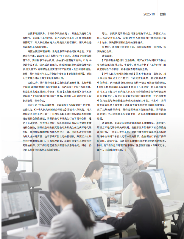 法院审理后认为,本案的争议焦点是:1.常先生发病死亡时为周六,是否属于工作时间,是否应认定为工伤;2.社保异地代缴情况下,用人单位所在地人社局是否具有管辖权,用人单位是否需承担工伤保险责任。
