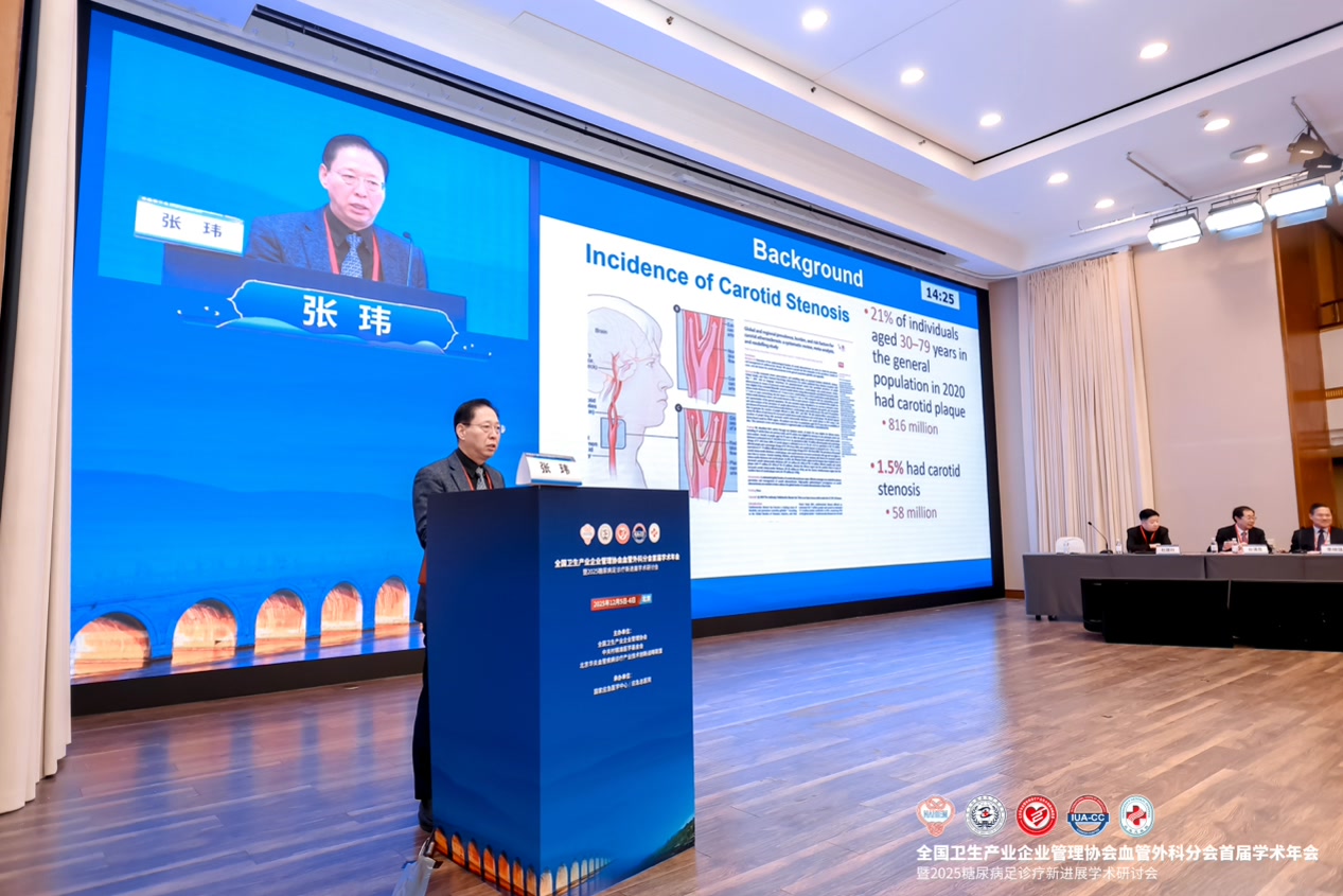 美国华盛顿大学张玮教授带来了关于《颈动脉狭窄病变腔内治疗进展》的精彩演讲。张教授首先解释了颈动脉狭窄的病理机制及其对脑部供血的影响,强调了早期诊断和治疗的重要性。张教授还展示了最新的临床数据,对比了不同治疗方法的效果,并讨论了如何根据患者的具体情况选择最合适的治疗方案。