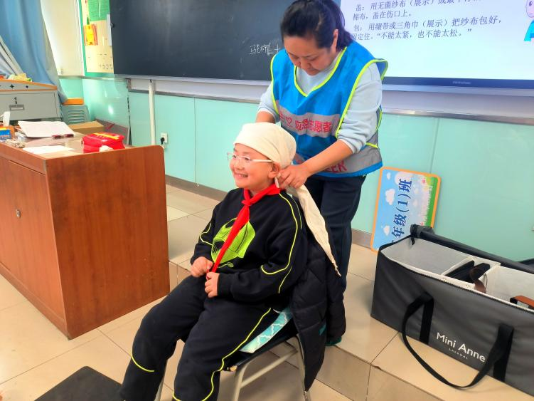 “看老师怎么用三角巾变出‘生命防护罩’!”急救老师以一名学生为模特,现场演示头部帽式包扎、手臂悬吊固定、膝盖八字包扎三大经典技法。银白色三角巾在老师手中翻飞,转眼间完成规范包扎,孩子们屏息凝神观察每个细节。