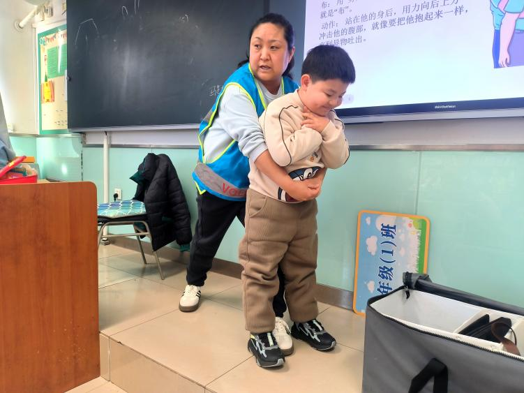 海姆立克急救法的“石头剪刀布”口诀成为全场焦点。老师通过“石头压肚脐,剪刀夹两侧,布包住拳头”的生动比喻,配合腹部冲击模拟演示,让孩子们快速掌握异物梗阻的急救要领。在“我是急救小能手”互动环节中,学生们两两配对,互相练习背部叩击与腹部冲击的配合使用,现场气氛热烈。