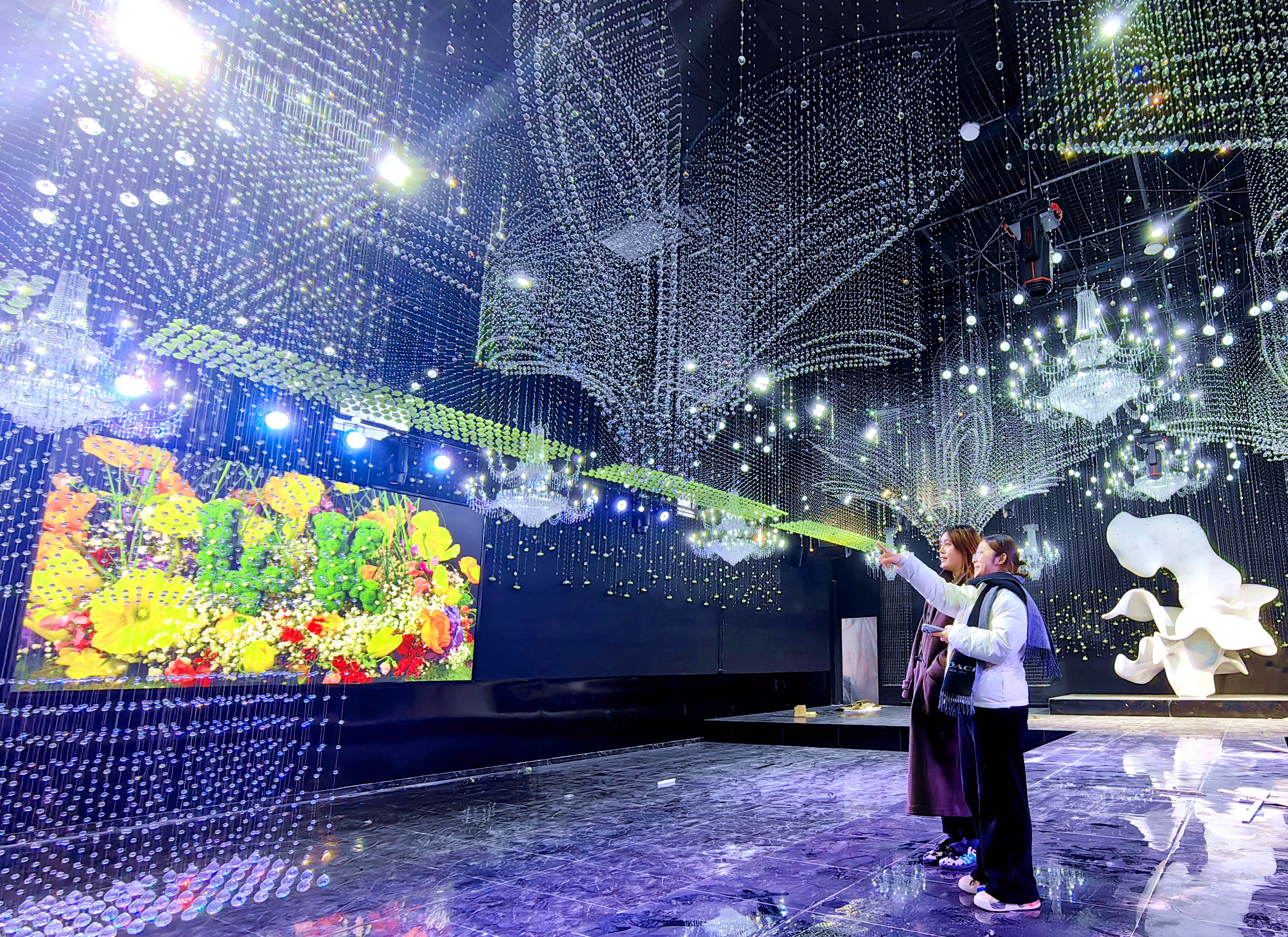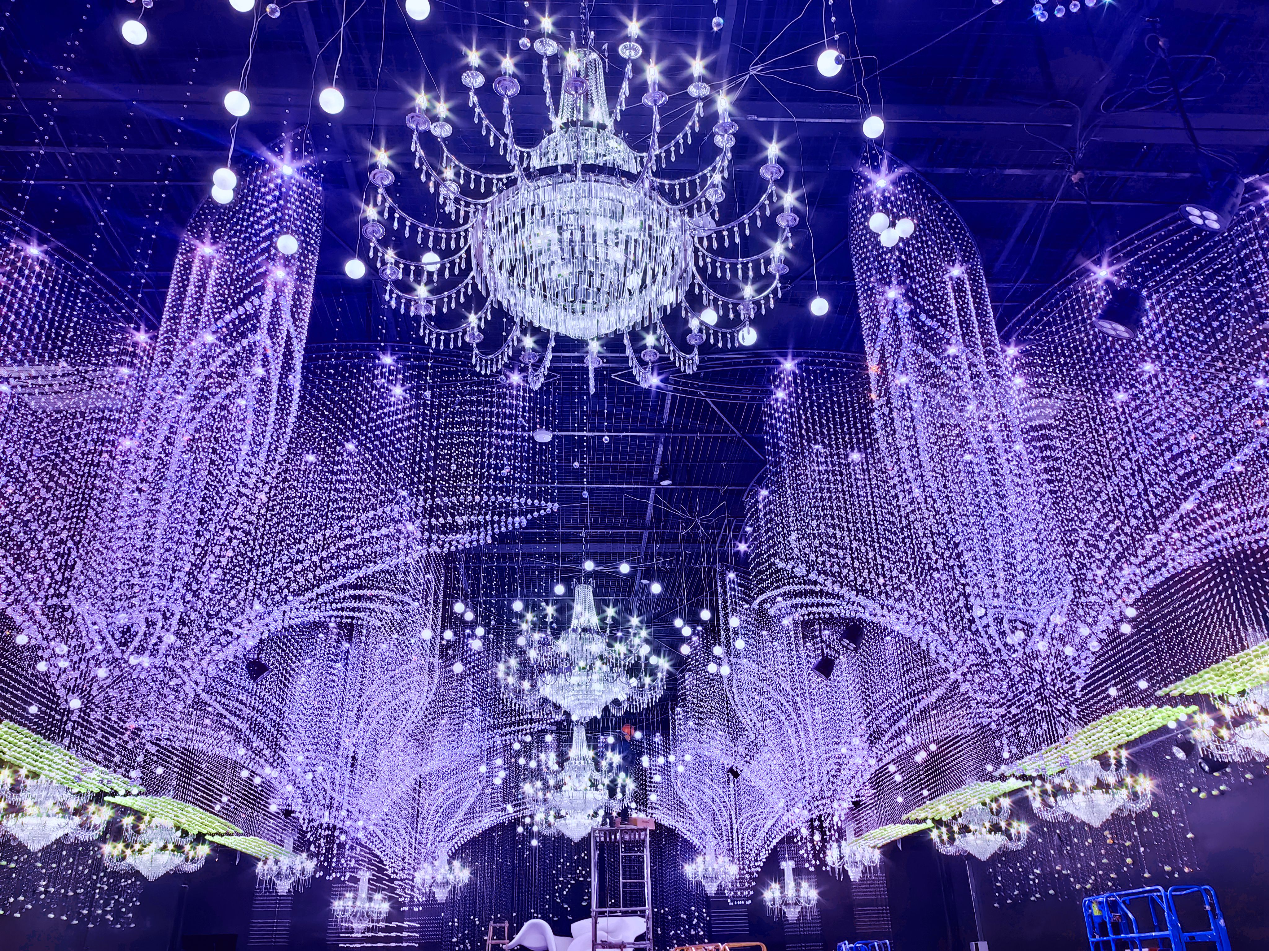 记者走进“暮光微澜” 厅,只见厅高大约 6 米,宽 15 米左右,长近30 米,高挑的穹顶下悬挂着 23 个大吊灯,数万颗水晶珠帘垂坠而下,洒落细碎星光;墙面、拱门以星星灯往上渐变,形成无限延伸的视觉幻境,既象征爱情的无垠与纯粹,又以暖调光影勾勒出浪漫轮廓,为婚礼、寿宴等喜庆场合增添温馨缱绻的氛围。