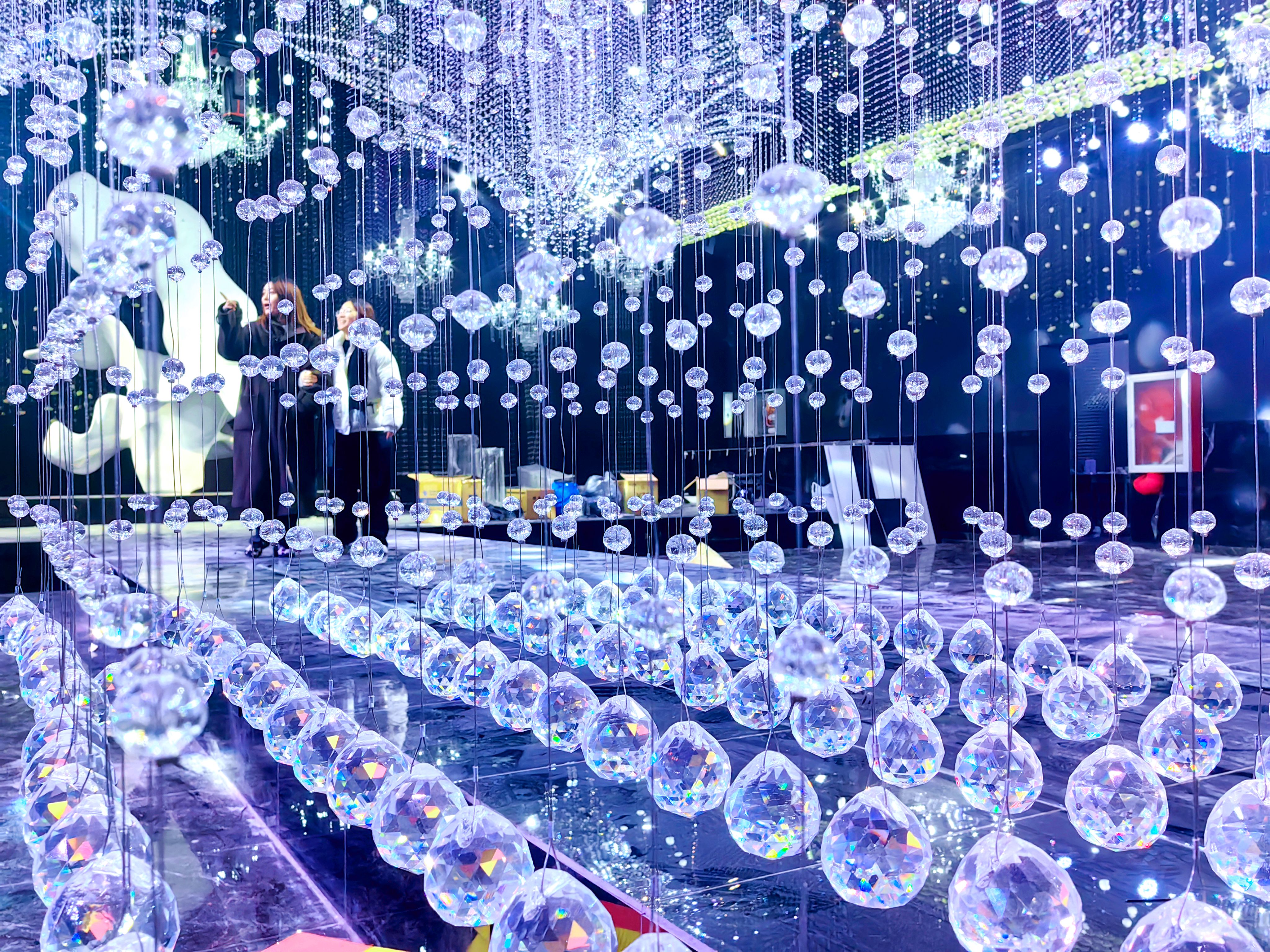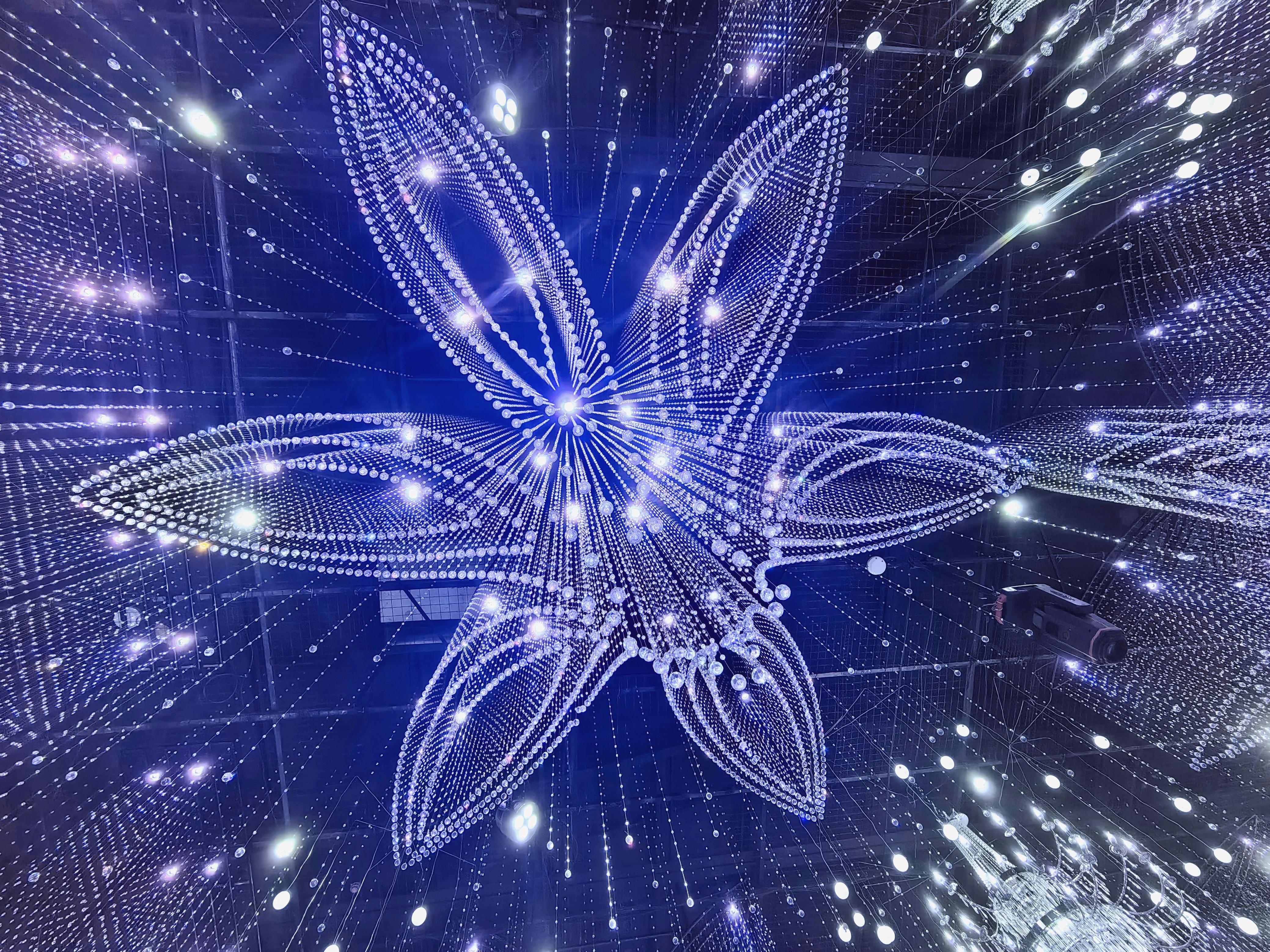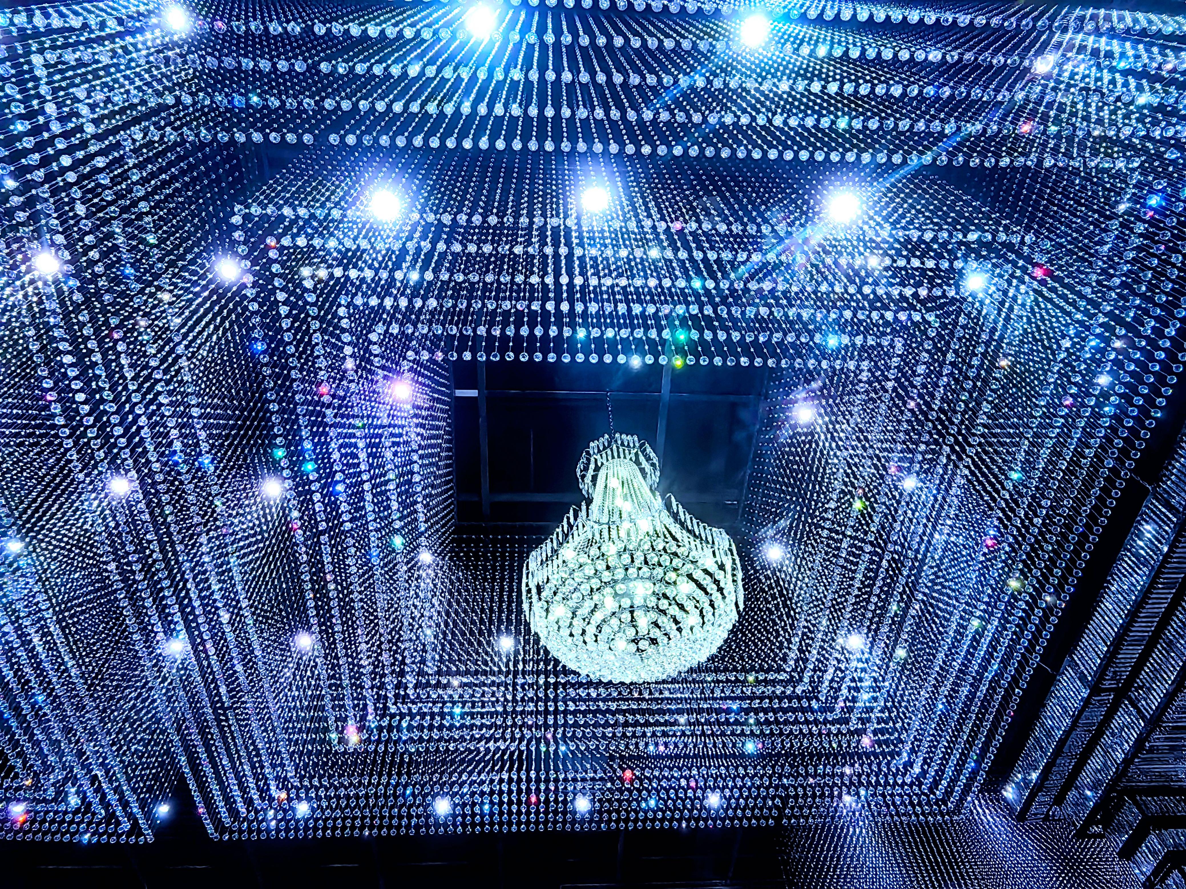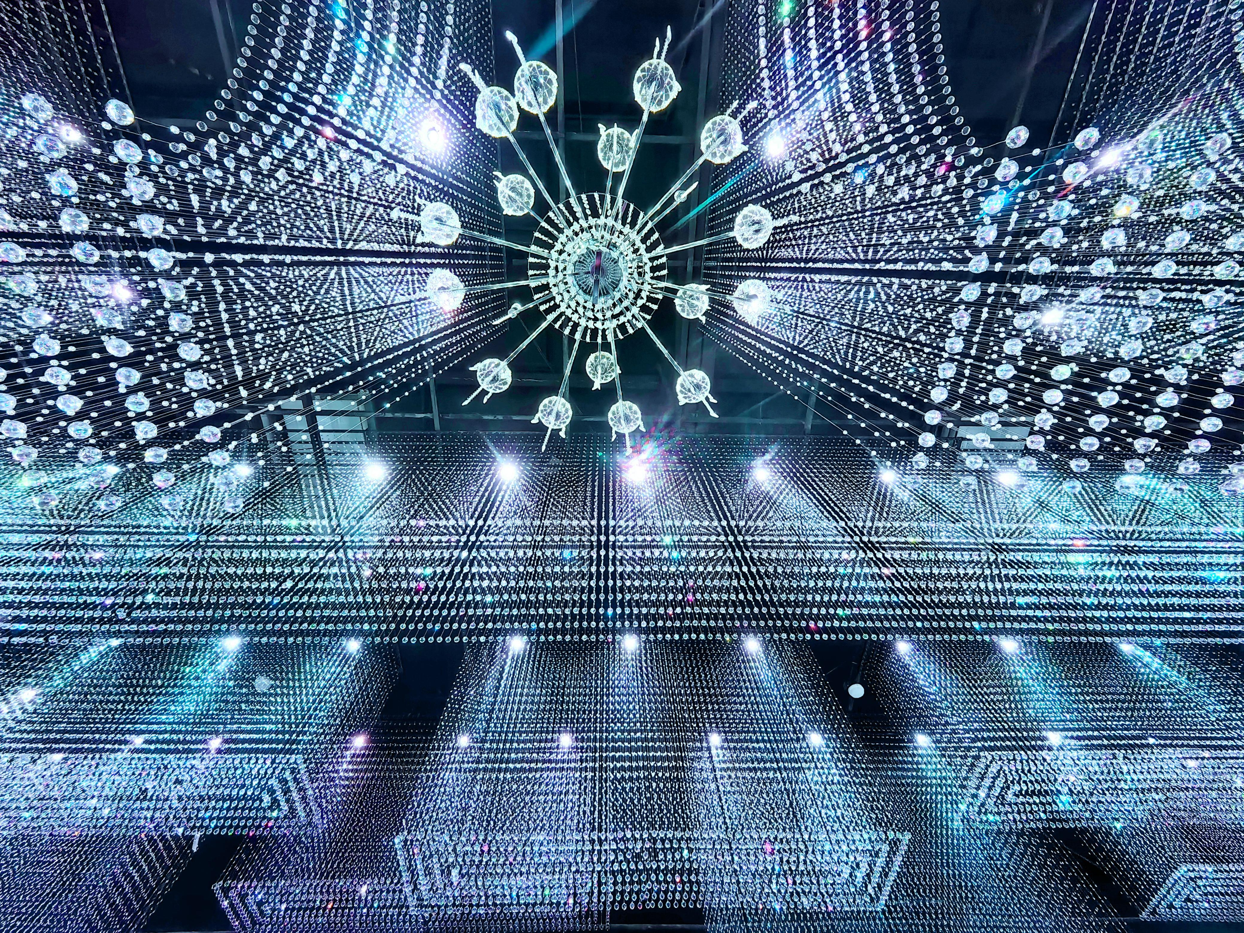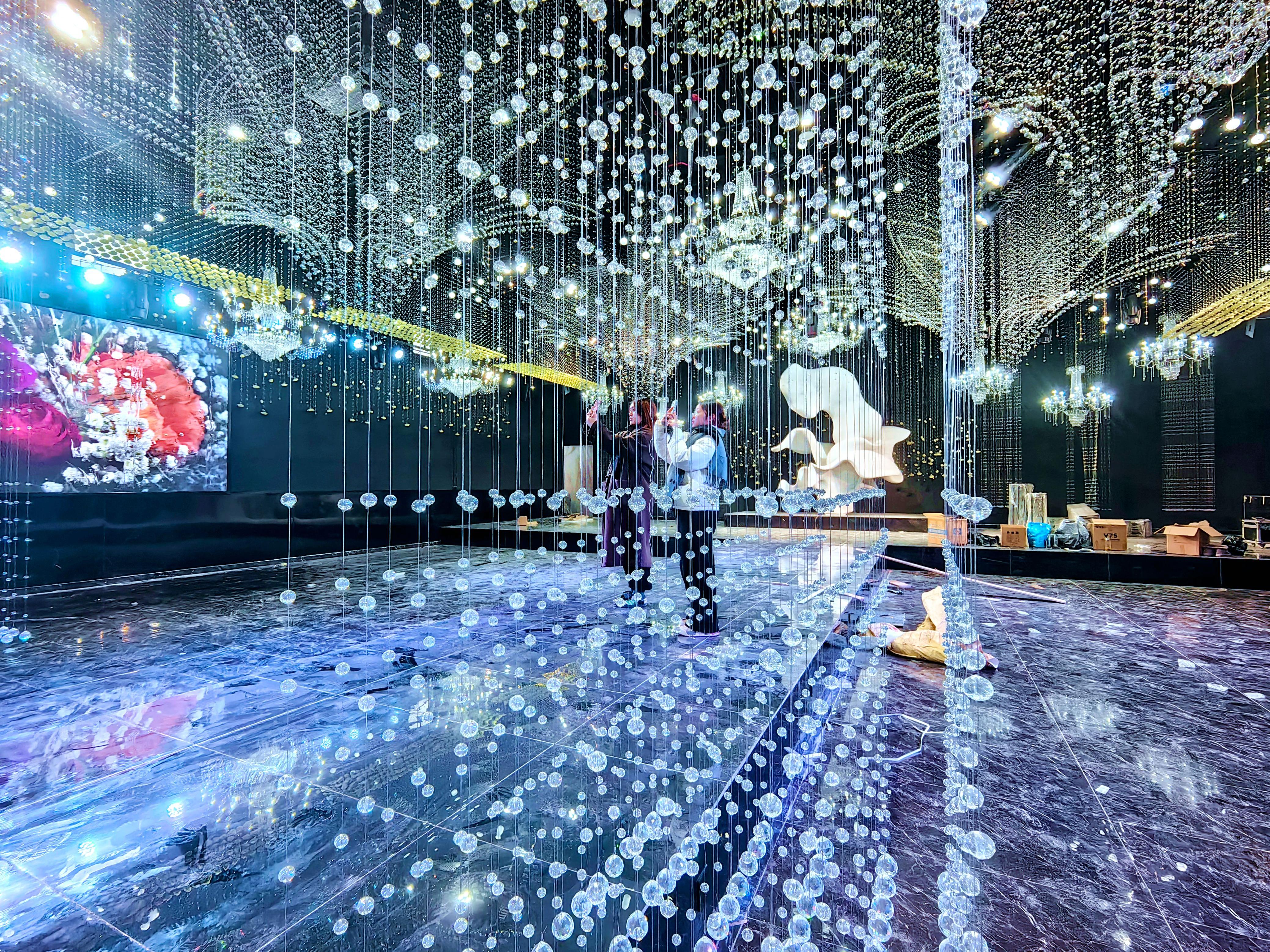 “克拉水晶” 厅以纯净剔透的水晶元素为主角,15 个大吊灯悬挂于高挑穹顶,垂坠着 10 万条水晶珠链,搭配简约轻奢的线条设计,自然光与人工灯光在此巧妙交织,光线穿透密集的水晶珠链,在地面、墙壁投射出斑斓光影,仿佛置身光之海洋,尽显大气典雅。