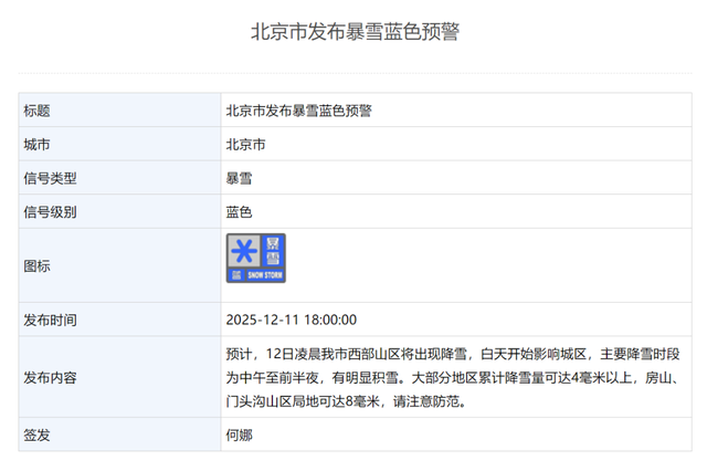 北京市气象台12日11时发布:今天下午阴有中雪,东转南风二三级,最高气温-3℃;夜间阴有小雪,南转北风一二级,最低气温-5℃。暴雪蓝色和道路结冰橙色预警中,出行注意交通安全。
