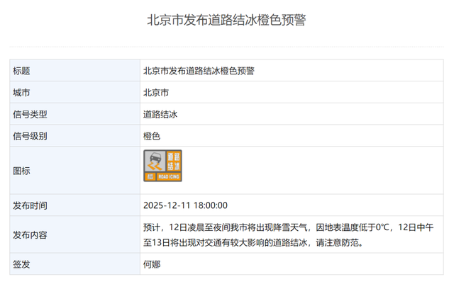 12月11日18:00,预计,北京市发布道路结冰橙色预警:预计,12日凌晨至夜间我市将出现降雪天气,因地表温度低于0℃,12日中午至13日将出现对交通有较大影响的道路结冰,请注意防范。