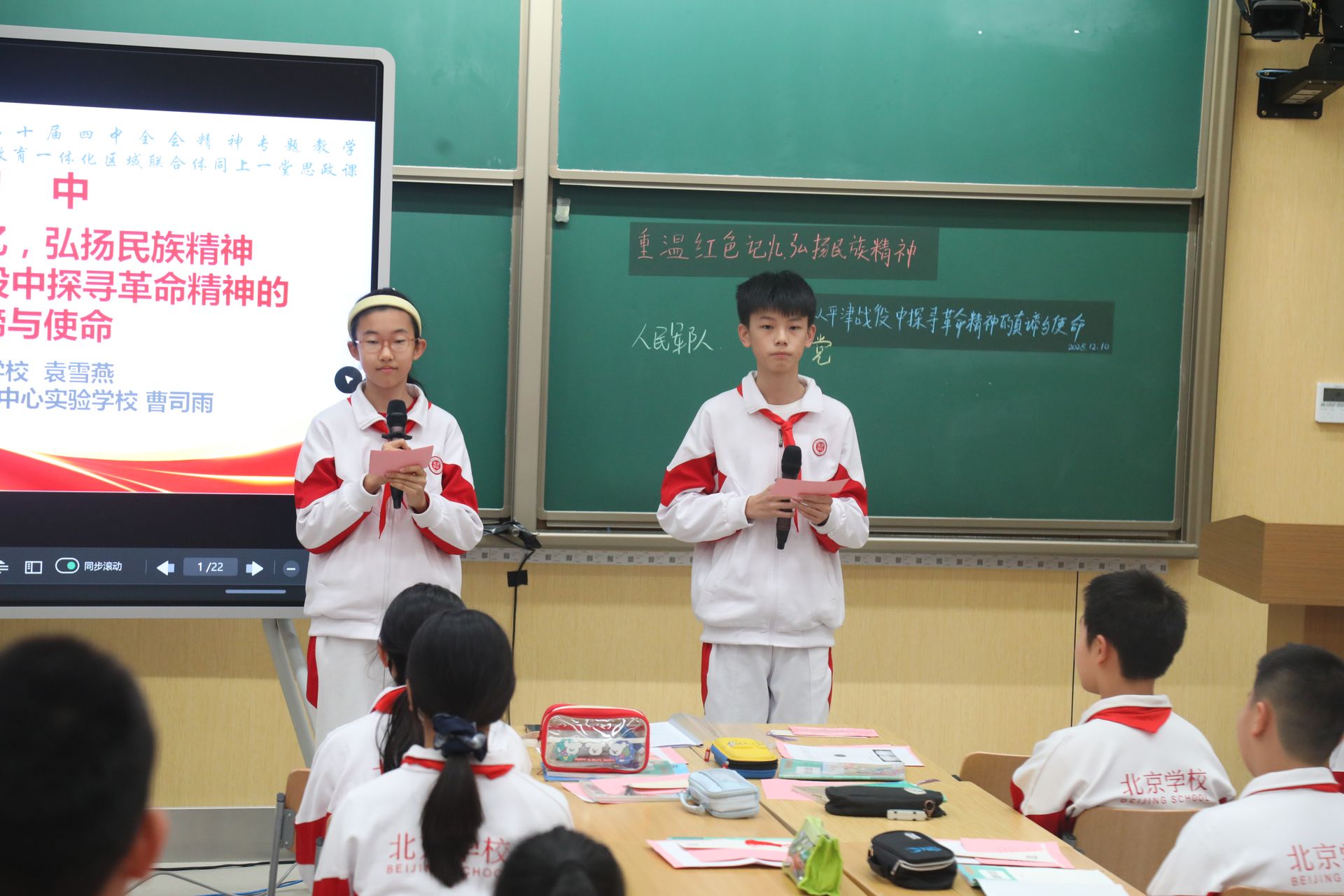 “如果文物会说话,它们会讲述怎样的历史?”在七年级的课堂上,北京学校、通州区教师研修中心实验学校两校师生“隔屏相见”,共同围绕指挥部旧址中的文物展开讨论。其中一件文物是刘鸿武战士的请战书。“重伤不哭不叫,轻伤不下火线,坚决保证完成战斗任务,为人民立功。”学生们集体朗读这封请战书。通过AI工具,学生们实现了一次与刘鸿武战士穿越时空的“对话”。他们追问战士为人民而战的初心,感受峥嵘岁月里的青春力量。