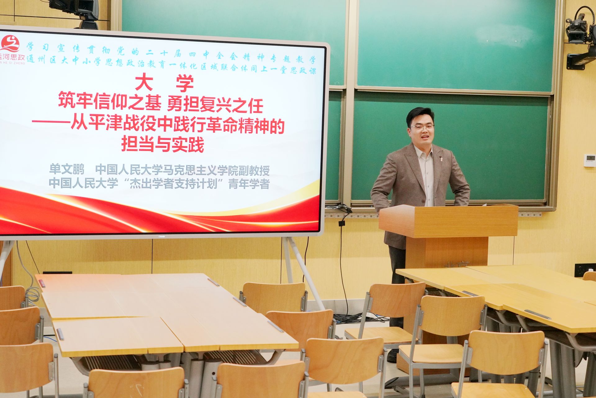 中国人民大学马克思主义学院副教授单文鹏介绍了大学段的教学设计,提出要将运河上的革命精神与中国共产党人精神谱系相结合,激励新时代青年筑牢信仰之基、勇担复兴之任。他认为,大中小学思政教育一体化的课程设计,实现了“直面各管一段的症结,以平津战役为抓手一气呵成;直插单打独斗的弊端,以革命精神为内核一体联动;直击抢跑错位的通病,以知信悟行为链条一触到底”。
