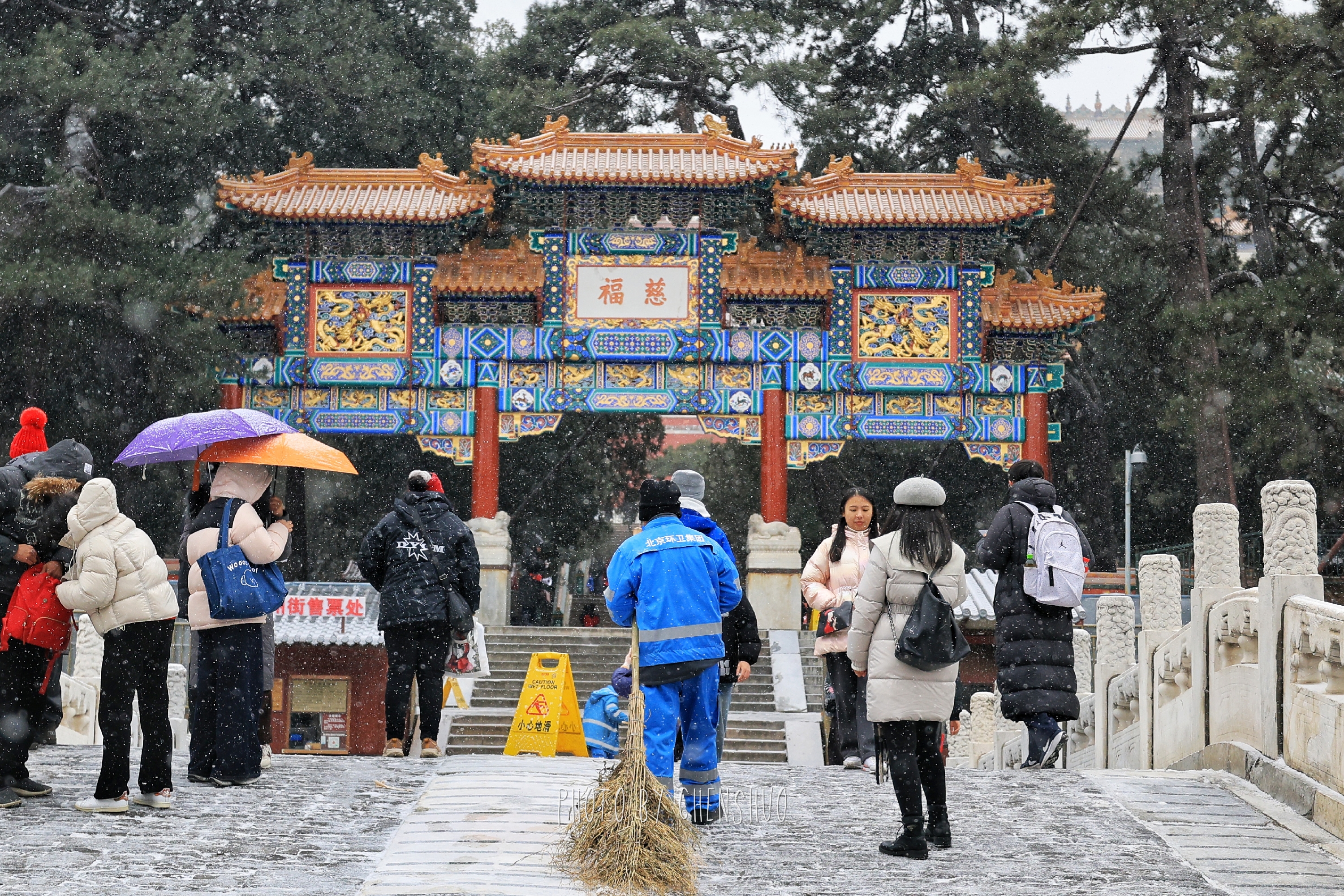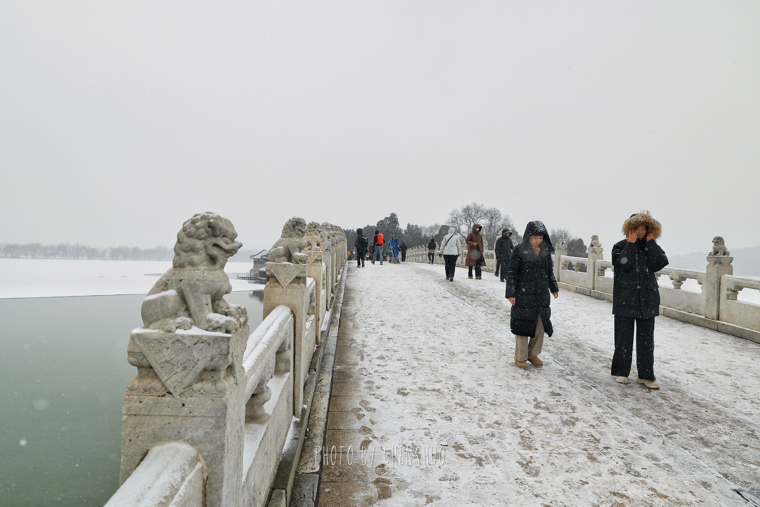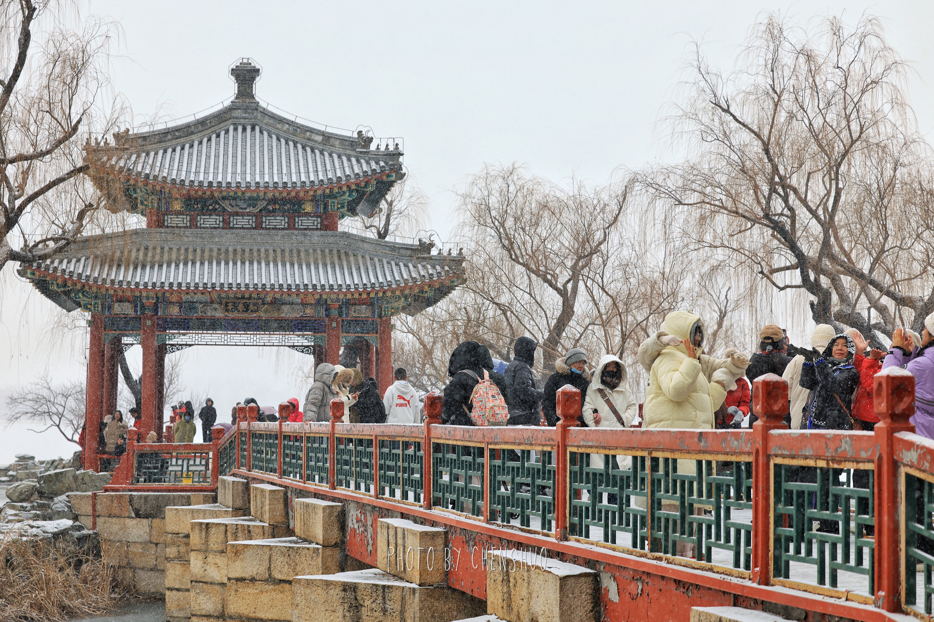 昆明湖面雾气氤氲,岸边的柳树挂满毛茸茸的雪穗,随风轻摆。十七孔桥在雪中更显庄重,桥洞如琴键般排列,连接着湖心与东岸的诗情画意。长廊蜿蜒曲折,梁枋上的彩绘在白雪映衬下色彩愈发鲜明。游客踏雪而行,或在石舫前留影,或在知春亭畔赏景,欢声笑语与簌簌雪声交织,为这座百年园林增添了灵动生机。