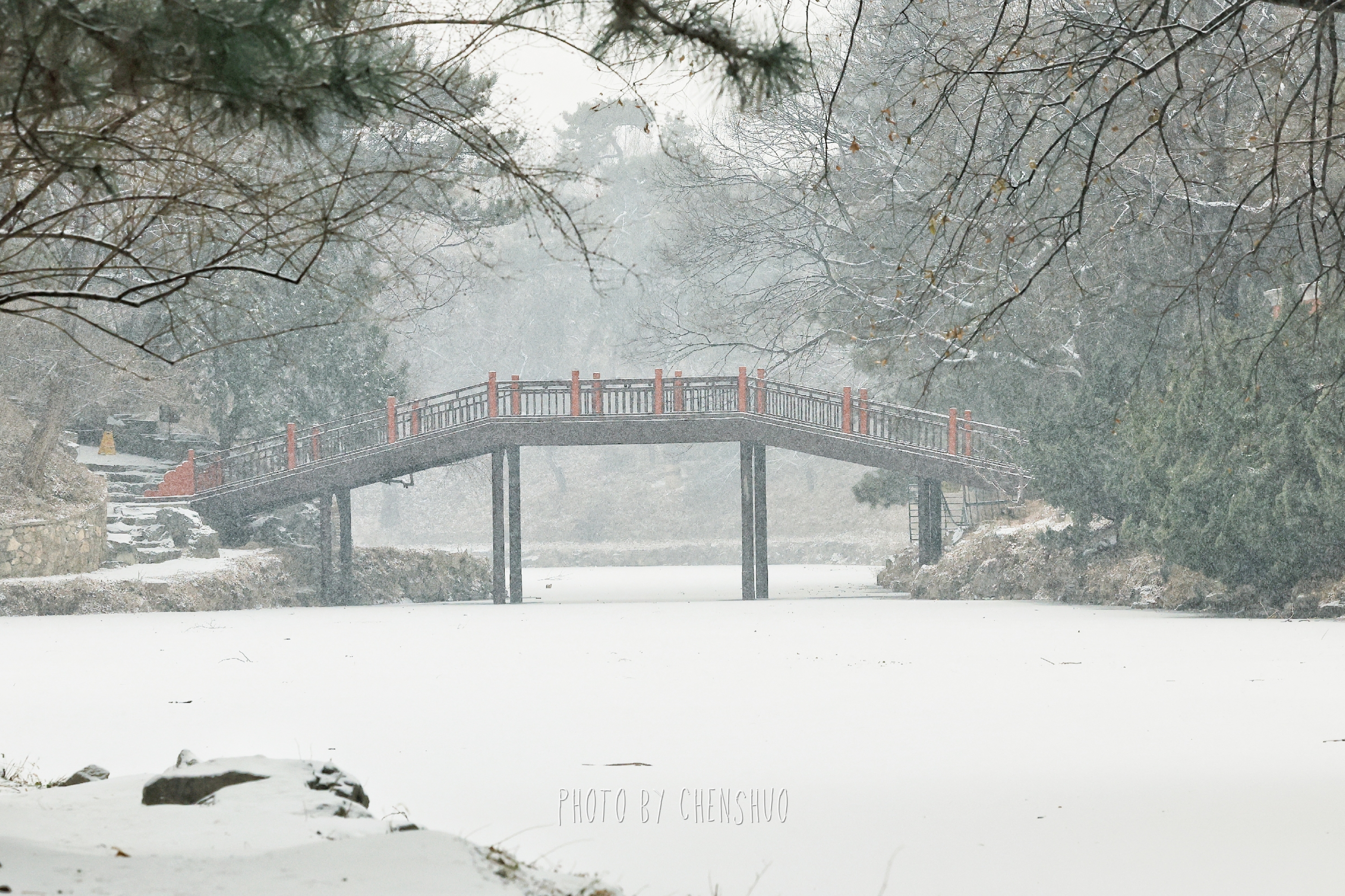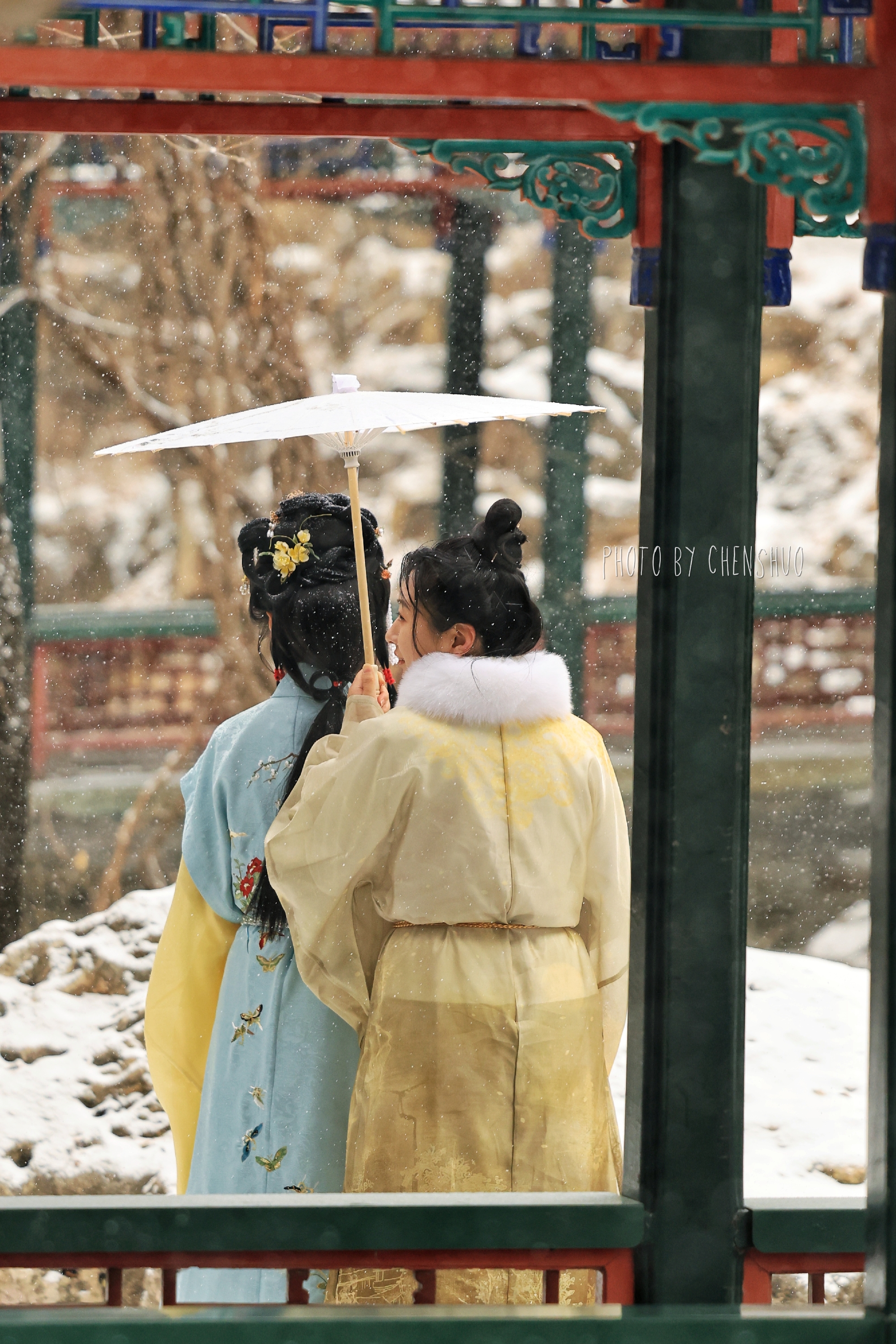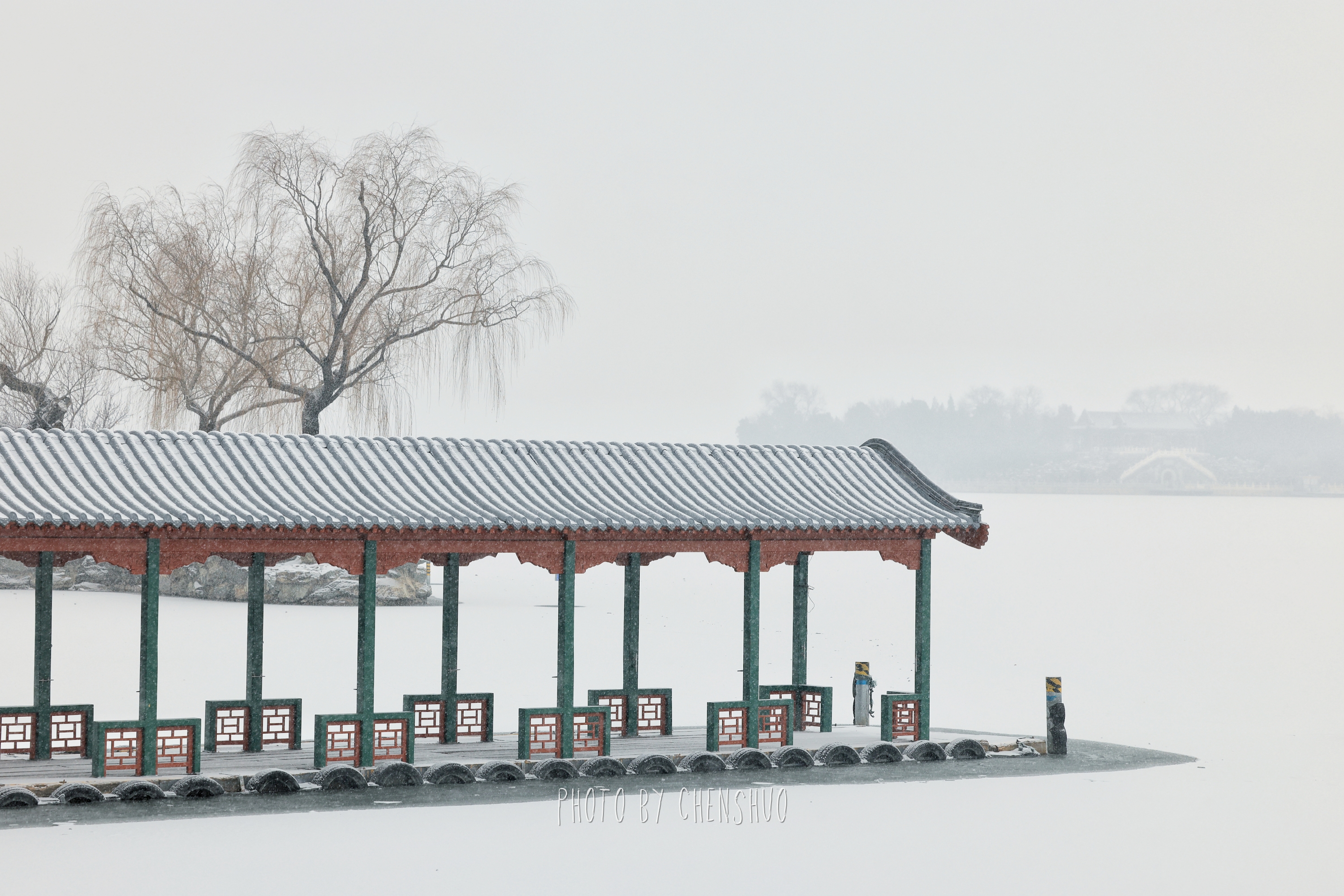 昆明湖面雾气氤氲,岸边的柳树挂满毛茸茸的雪穗,随风轻摆。十七孔桥在雪中更显庄重,桥洞如琴键般排列,连接着湖心与东岸的诗情画意。长廊蜿蜒曲折,梁枋上的彩绘在白雪映衬下色彩愈发鲜明。游客踏雪而行,或在石舫前留影,或在知春亭畔赏景,欢声笑语与簌簌雪声交织,为这座百年园林增添了灵动生机。
