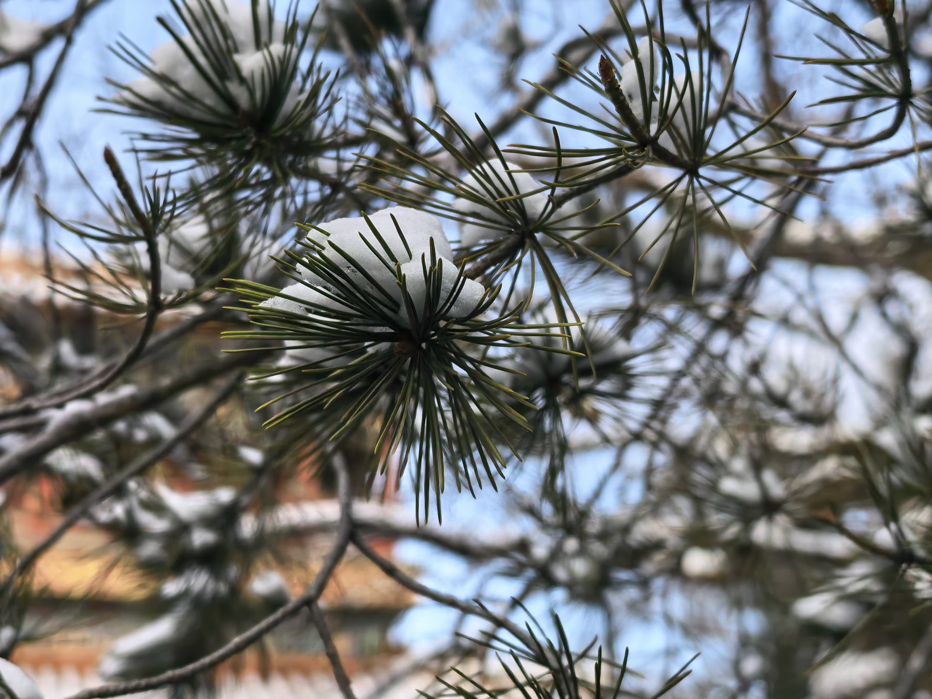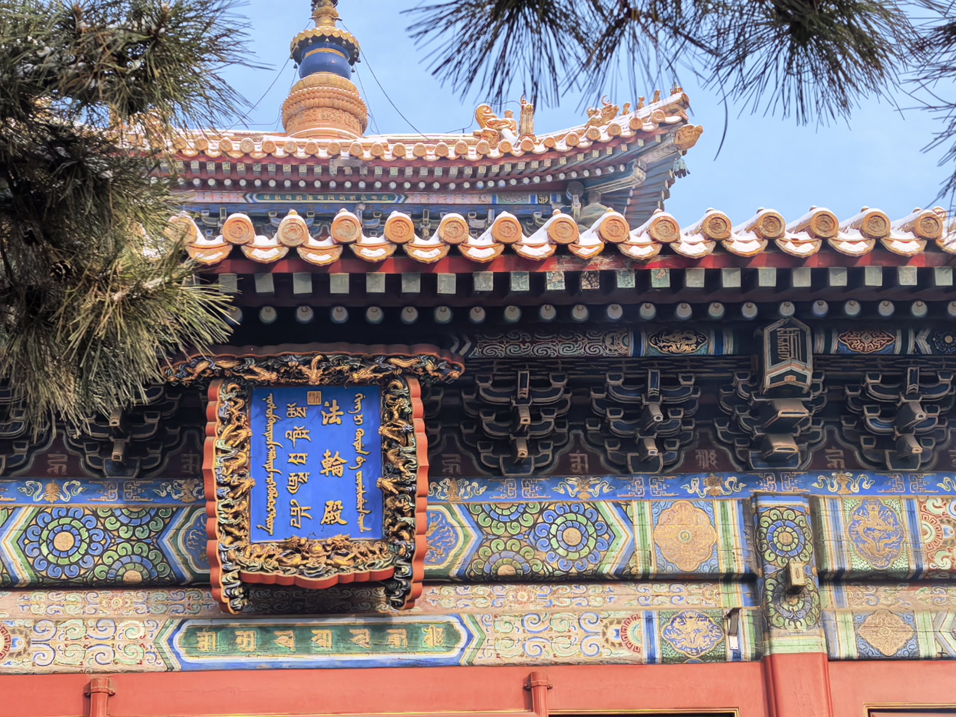 法轮殿是雍和宫的建筑核心。其重檐歇山顶上,那“一大四小”的五座鎏金藏式鎏金宝顶(梵语称“噶丹却松”),已被积雪塑造成五座温润的雪丘,在灰白天光下静静发光。然而,最摄人心魄的,却是殿前庭院中央那株著名的古松。其主干需数人合围,树皮斑驳如龙鳞,此刻,无数虬曲的枝桠承托着蓬松厚重的积雪,向下弯出谦逊而优美的弧度,形成千万条琼枝玉柯。清代官修《日下旧闻考》中确有此树记载:“雍和宫法轮殿前有古松一株,虬枝盘屈,状若翔凤。”经植物学者与宫内记载印证,此树为白皮松,植于乾隆年间,树龄已逾二百五十载。一队南方来的游客在树下仰首惊叹,导游正解释其学名与习性。我独自站在稍远处,感受着这份静默的压迫感。北宋郭熙在《林泉高致》中论画冬山:“冬山惨淡而如睡。”眼前这株负雪的苍松,便是整座雍和宫冬日精魂的化身——它并非死去,而是在严寒中沉入最深沉的睡眠,每一根覆雪的枝条,都在积蓄着无人能窥见的、磅礴的生机。