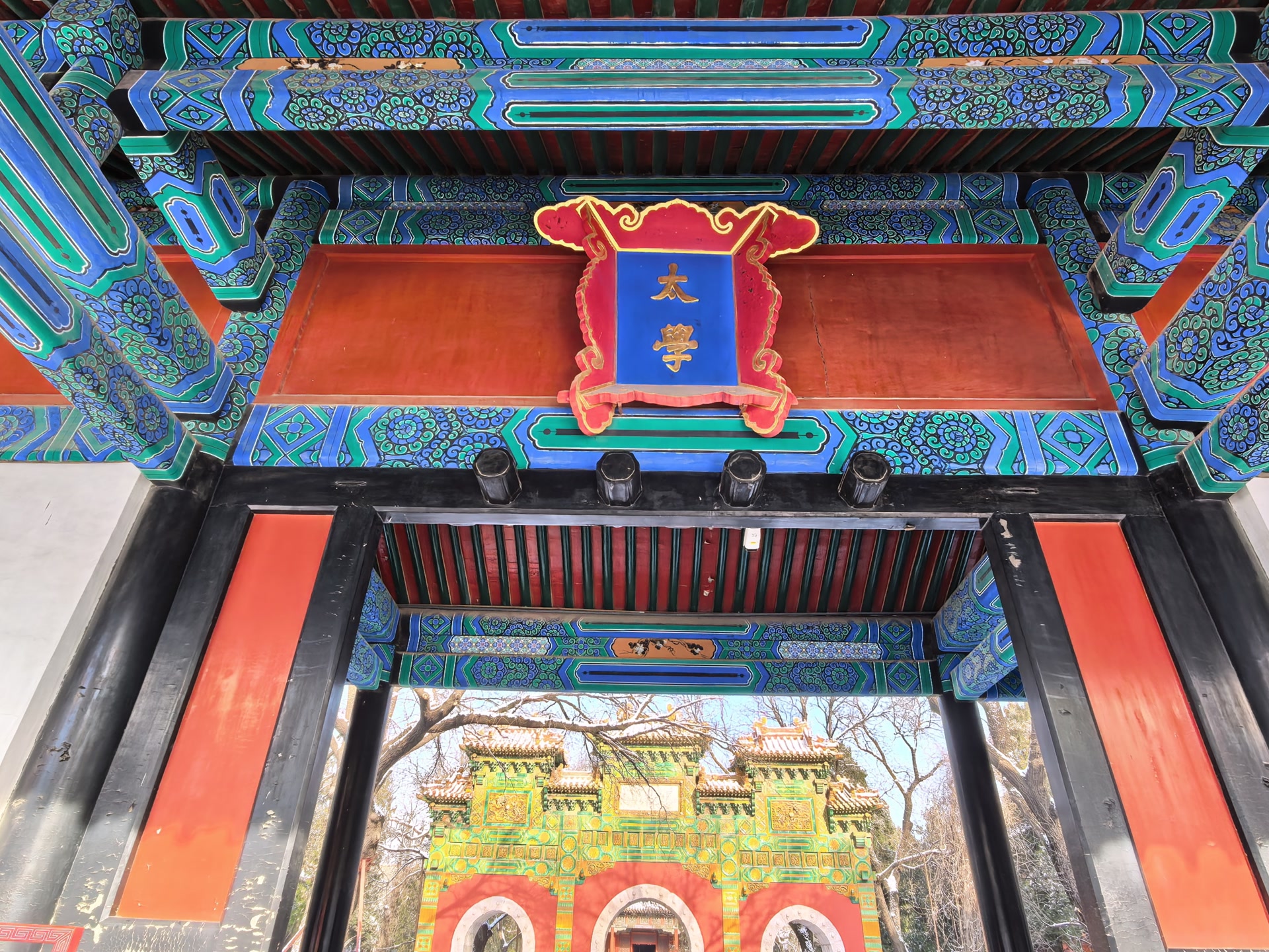 国子监建筑群的核心,是那座矗立于圆形水池中央的方形重檐大殿——辟雍。此殿建于乾隆四十九年(公元1784年),取《周礼》“辟雍环水”之古制,意喻“教化流行,圆通周遍”。水池已冻成一片坚实的墨玉,我小心踏上去,冰面发出沉稳的承重之声。立于池心,四顾茫然,辟雍殿四面通透的隔扇门、精雕的槛窗、朱红的廊柱,连同其倒影,皆被禁锢在冰层之下与薄雪之上,虚实相生,光影交错,构成一个迷离而肃穆的幻象空间。