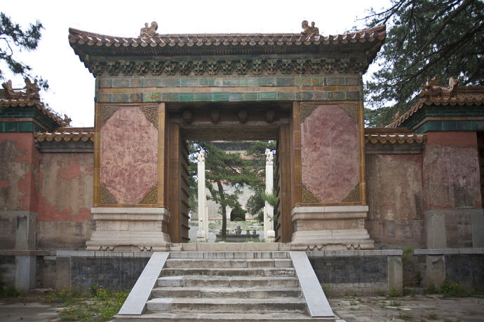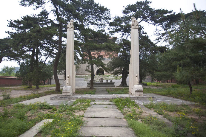 【注释】金山,位于北京市海淀区西部,东南距佛香阁5公里,正蓝旗村北1公里。金山麓娘娘府曾有明代皇族、皇后及妃嫔的墓90余座。直北,正北。玄堂,王者墓穴里北端的墓室。此指明宪宗茂陵地宫。黯淡,阴沉。风云,喻高处。双凤,谓兄弟才学并美,盖为明孝宗弘治皇帝的两个弟弟。祎衣,祎,美。姜嫄,上古时代人物,姜姓,陕西省武功县人,原为炎帝后代有邰氏的女儿,后来成为黄帝曾孙帝喾高辛氏的元妃。姜嫄踩巨人足迹而生下后稷,后稷教人务农,成为中国的农耕始祖,也是周人的祖先。《诗经·大雅·生民》的开端说:“厥初生民,时维姜嫄。生民如何,克禋克祀,以弗无子。履帝武敏歆,攸介攸止,载震载夙,载生载育,时维后稷。”《诗经·鲁颂·閟宫》说:“赫赫姜嫄,其德不回,上帝是依。六龙,古代天子的车驾为六马,马八尺称龙,因以为天子车驾的代称。 汉刘歆《述初赋》有句:“揔六龙于驷房兮,奉华盖于帝侧。” 唐李白 《上皇西巡南京歌》之四有:“谁道君王行路难,六龙西幸万人欢。” 明陶宗仪《辍耕录·金鳌山》有:“少焉,千乘万骑毕集,始知为六龙临幸。”近代诗词曲作家吴梅《步北城狮子山访阅江楼遗址不得》诗有:“六龙曾此驻云车,何处重寻帝子家。”妫汭,妫水隈曲之处。传说舜居于此,尧将两个女儿嫁给他。 妫水在山西省永济县南,源出历山 ,西流入黄河。《书·尧典》:“厘降二女于妫汭,嫔于虞 。” 孔传:“ 舜为匹夫,能以义理下帝女之心于所居妫水之汭,使行妇道于虞氏 。” 陆德明释文:“汭,音如鋭反,水之内也。” 杜预注《左传》云:“水之隈曲曰汭。” 孔颖达疏:“ 妫水在河东虞乡县历山西,西流至蒲坂县南入于河 。 舜居其旁。”南朝 宋 谢庄 《宣太后歌》有句:“嗣徽妫汭 ,思媚周姜。母临万宇,训蔼紫房。”哀册,同“哀策”。君主时代,帝后崩逝,颂扬其功德的文字,多用韵语写成。《唐·杨烱·中书令汾阴公薛振行状》:“孝敬崩,诏公为哀册。”坤仪,大地。穆,端庄。庙,宗庙明堂。旧时供祀祖宗的屋舍。