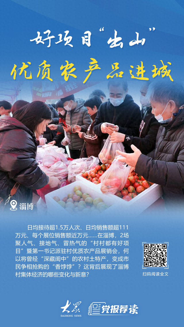 日均接待超1.5万人次、日均销售额超111万元、每个展位销售额近万元……在淄博,2场聚人气、接地气、冒热气的“村村都有好项目”暨第一书记派驻村优质农产品展销会,何以将曾经“深藏闺中”的农村土特产,变成市民争相抢购的“香饽饽”?这背后展现了淄博村集体经济的哪些变化与新意?