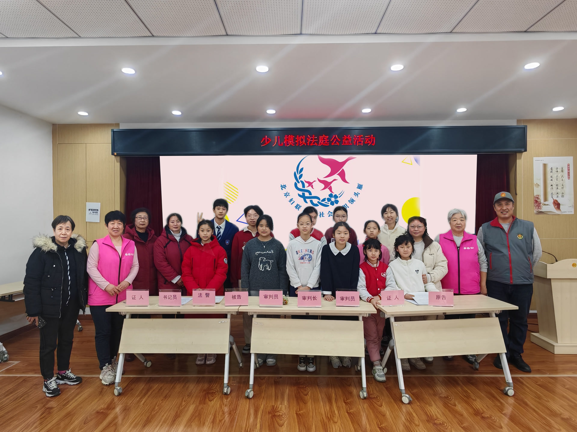 2025年12月14日,由北京红爹之家妇女儿童志愿服务促进中心主办的北京市妇联系统社会组织领头雁成长项目——“青春护航·法润成长”青少年法律素质提升活动之“少儿模拟法庭”体验活动圆满落幕。活动先后于12月6日、7日、14日走进北京市朝阳区粱会兰巾帼志愿阳光站、东城区建国门街道西总布社区、海淀区石油共生大院巾帼志愿阳光站,以沉浸式角色扮演的创新形式,为三地青少年带来生动鲜活的法治教育课,累计吸引百余组家庭参与,让法治精神在青少年心中扎根发芽。参与本次活动的志愿者团队有北京红色少儿艺术团、八里庄街道少儿艺术团,梁会兰巾帼志愿服务队和石油大院家庭志愿服务队。全国最美志愿者梁会兰、首都最美志愿者庞璐、吴波、张娜,北京市五星级志愿者张春红,以及北京市妇联系统社会组织领头雁成长项目的李薇老师到场助阵。