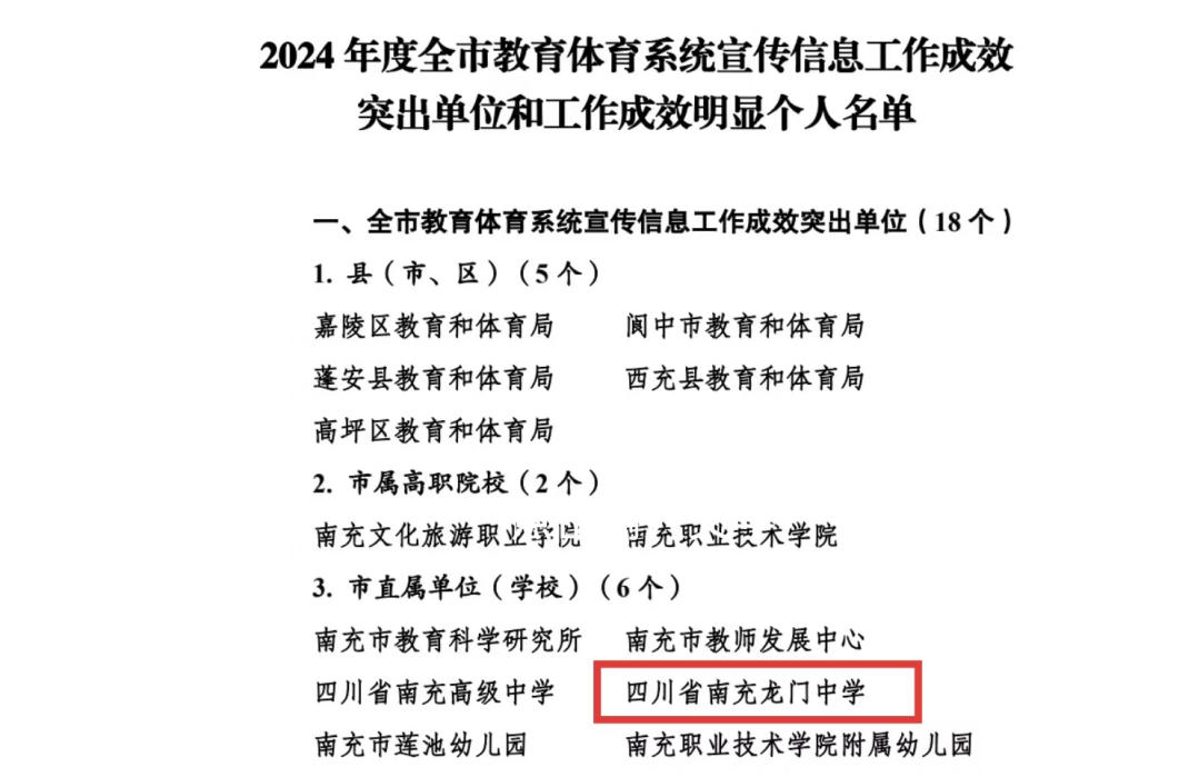 近日,2024年度全市教育体育系统宣传信息工作成效突出单位和工作成效明显个人名单公布,南充龙门中学获评全市教育体育系统宣传信息工作成效突出单位。