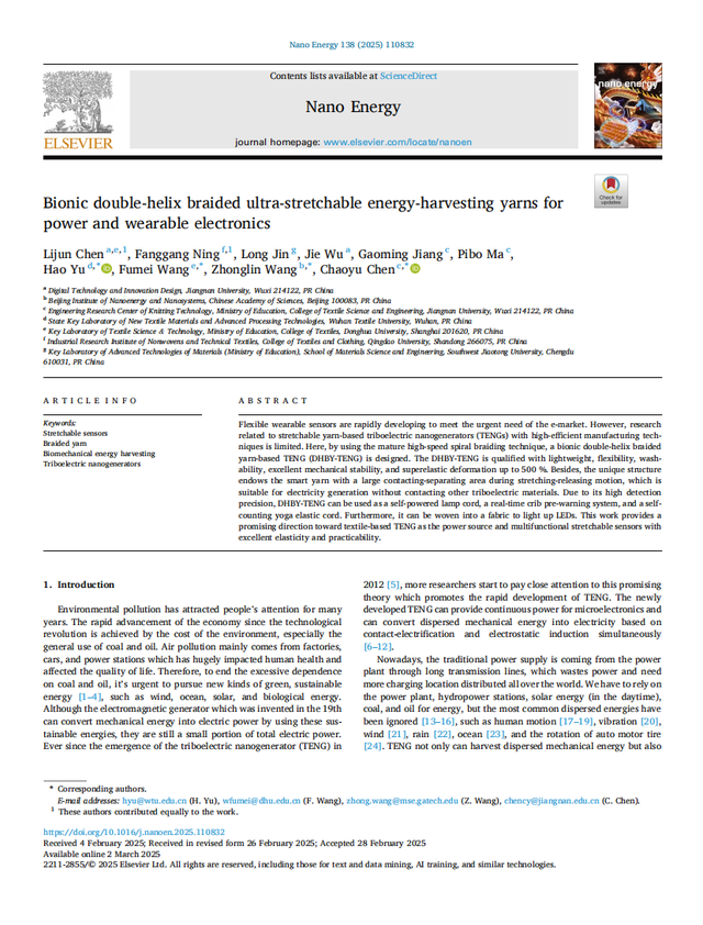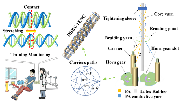 随着5G和物联网的发展,可穿戴柔性传感器在人体机能接口、医疗监测和软体机器人中有广泛应用,吴杰同学聚焦于智能可穿戴领域学习。摩擦纳米发电机(TENGs)通过将机械能转化为电能,实现自供电,可用于人体健康、运动监测及传感。然而,基于应变纱线基摩擦纳米发电机(TENGs)传感器的舒适性、灵敏度、检测限、高效制造技术的相关研究较为有限。