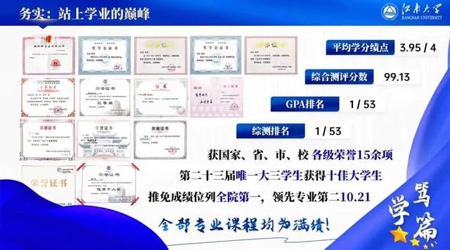 在本科四年的学业生涯中,他平均学分绩点达3.95,2024-2025学年绩点4.0,课程均分高达92.94,全部专业课程均为满绩,GPA排名和综合测评排名连续三年位列专业第一。获得国家、省、市、校各级荣誉15项。
