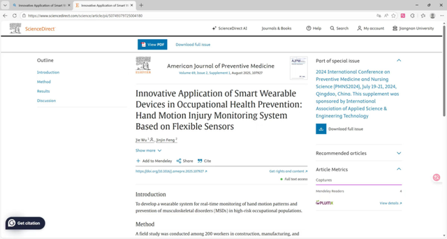 该系统用于实时监测手部动作模式并预防高风险职业人群的肌肉骨骼疾病,这项可穿戴技术为劳动密集型行业的MSD预防提供了可扩展的解决方案。通过将实时动作分析与有针对性的干预相结合,以降低伤害风险并提升工作安全性。