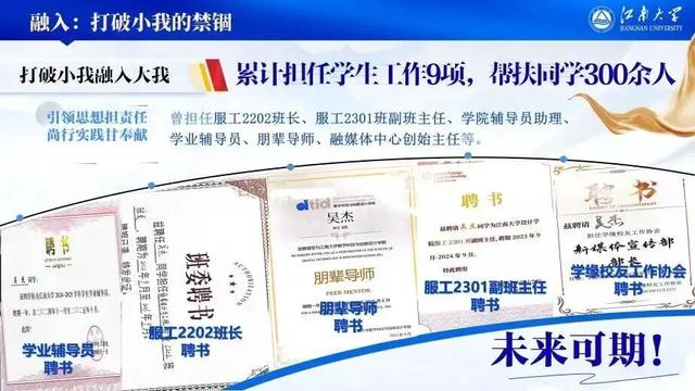 他的本科四年绝不仅限于此,他打破小我禁锢,积极将个体小我融入集体大我。他担任学院融媒体中心创始主任、朋辈导师、学业辅导员等9项职务,积极发挥朋辈帮扶作用,累计帮扶同学300余人。