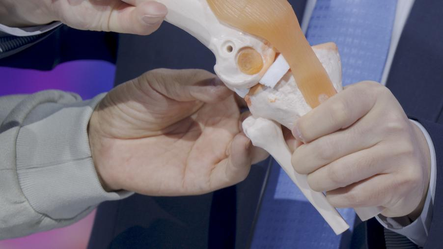 周主任通过模拟道具形象演示,一旦出现长时间用外八字的姿势走路,膝盖就会出现外翻拧住的状态,形成旋转剪切力,就会很大程度长年累月磨损半月板。所以外八字走路的时候,不是膝关节均匀受力了,而是一个错误的点着力,会把半月板磨损、压坏!
