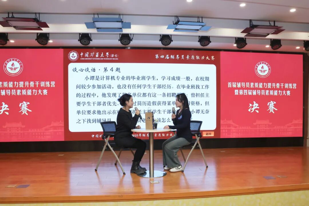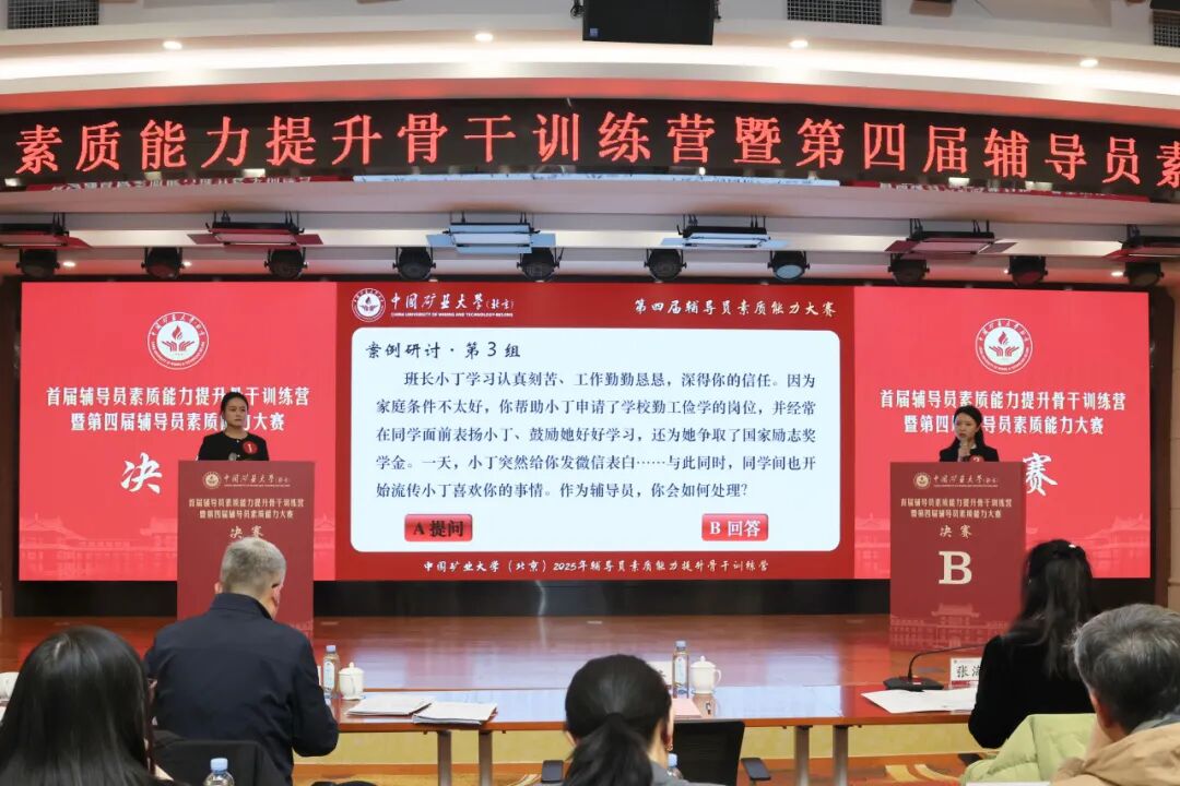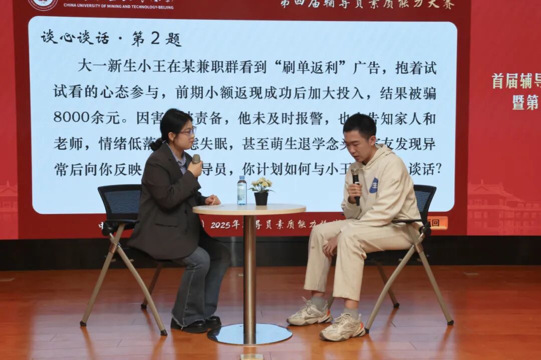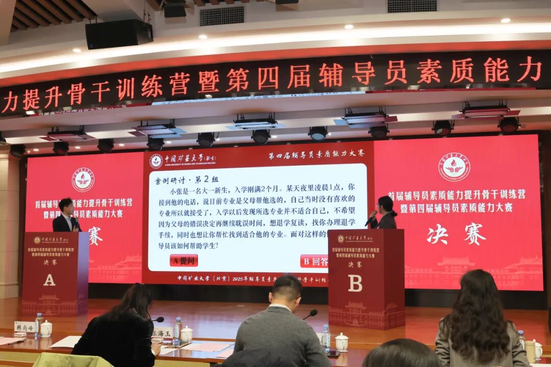 决赛设置案例研讨与谈心谈话两大核心环节,题目紧扣辅导员工作的热点难点,聚焦“网络舆情应对”“刷单诈骗防范”“AI学术不端治理”等现实问题场景,精准对接辅导员日常工作问题痛点,激发了现场辅导员的深度思考和强烈共鸣。面对具有现实针对性的考题,参赛选手沉着应战,结合自身工作经验和训练营所学所得,逐一提出了具体详实、切实可行的解决方案。