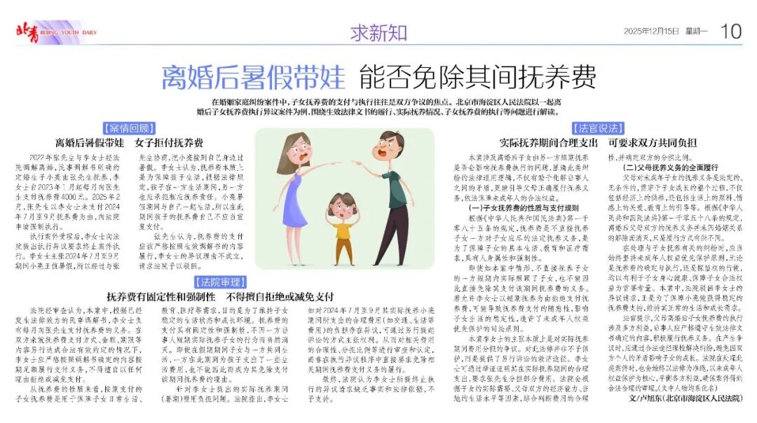 离婚后暑假带娃 女子拒付抚养费