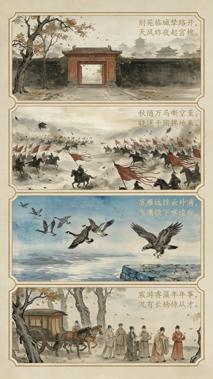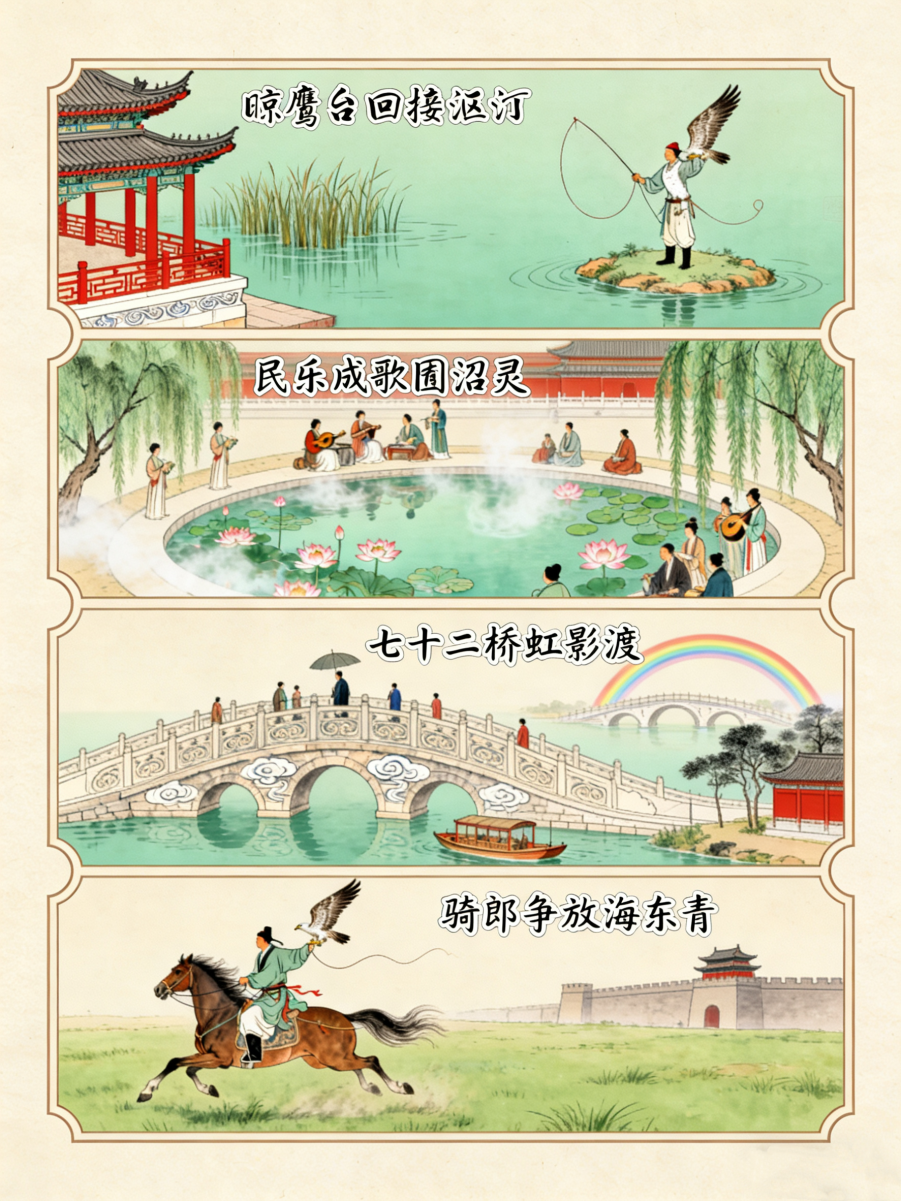 这首诗用生动的笔触描绘了皇家园林的壮观景象和皇帝出游的盛况,一字一句带我们回到了那盛大的场景。