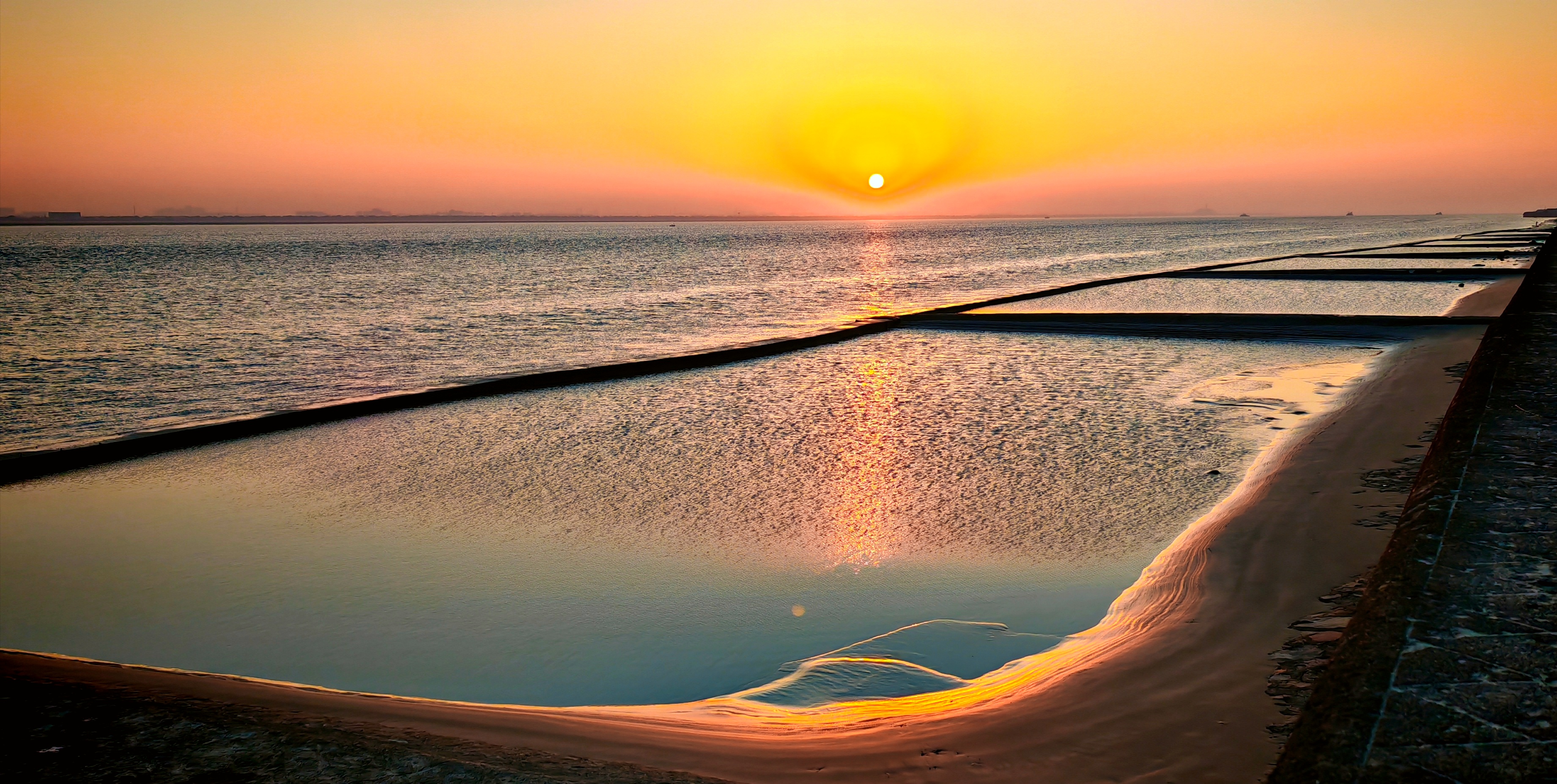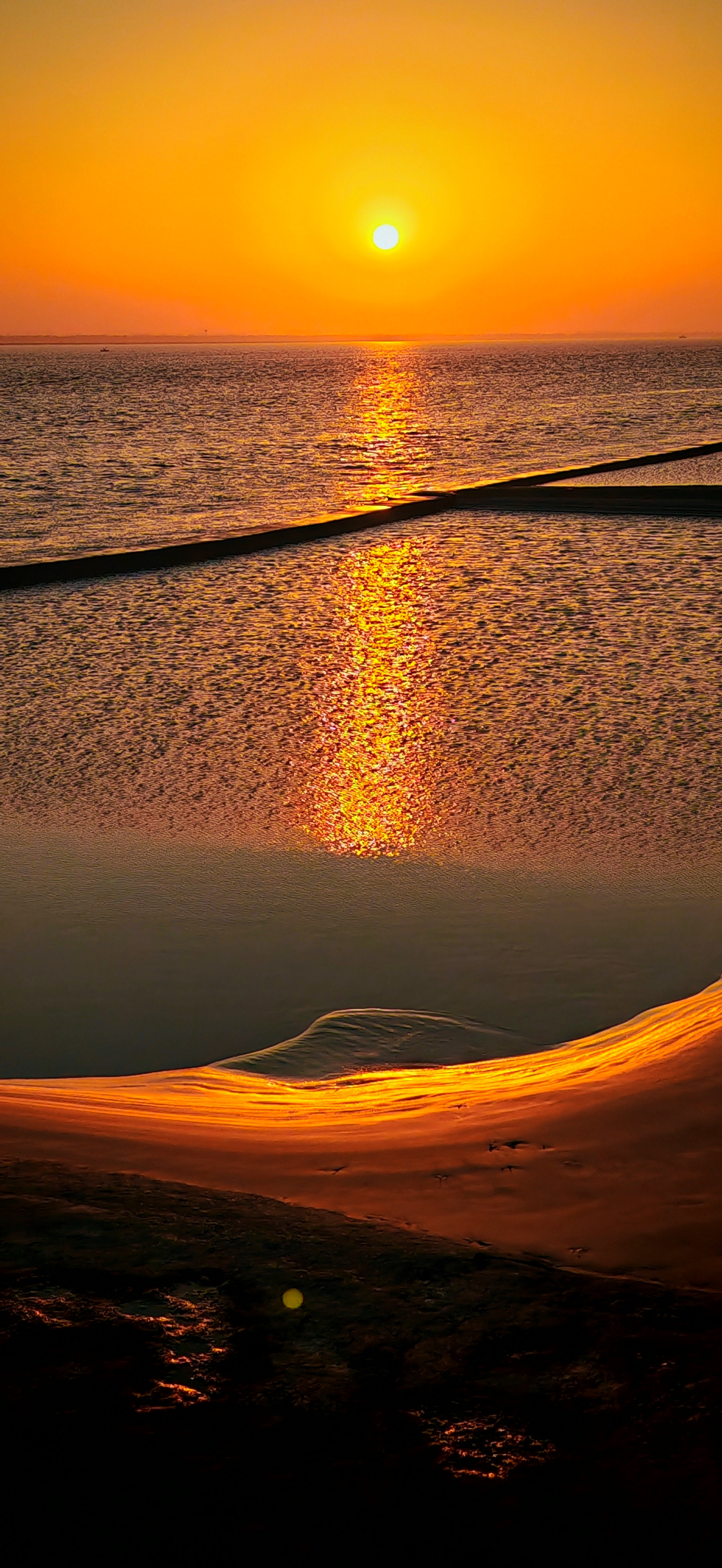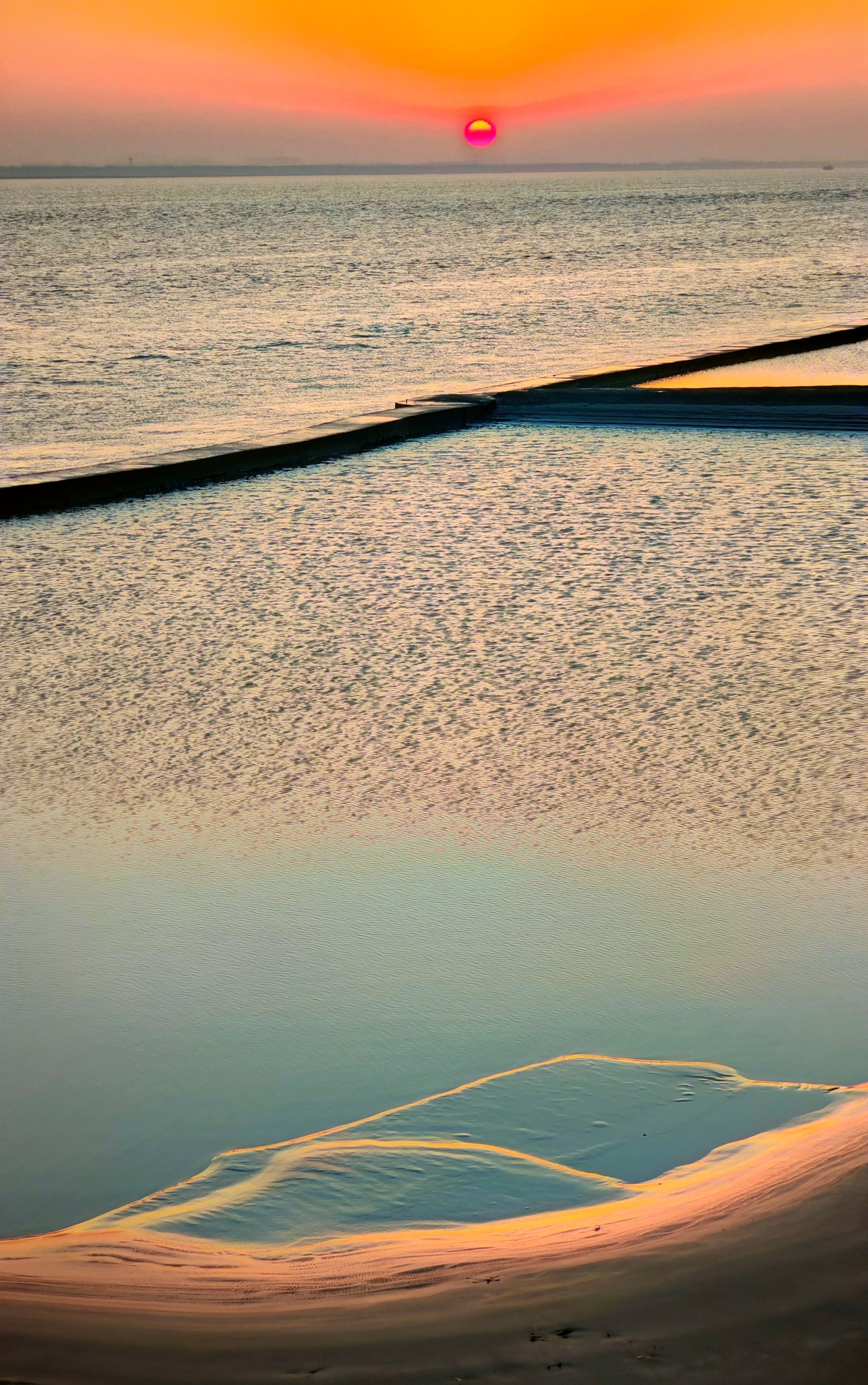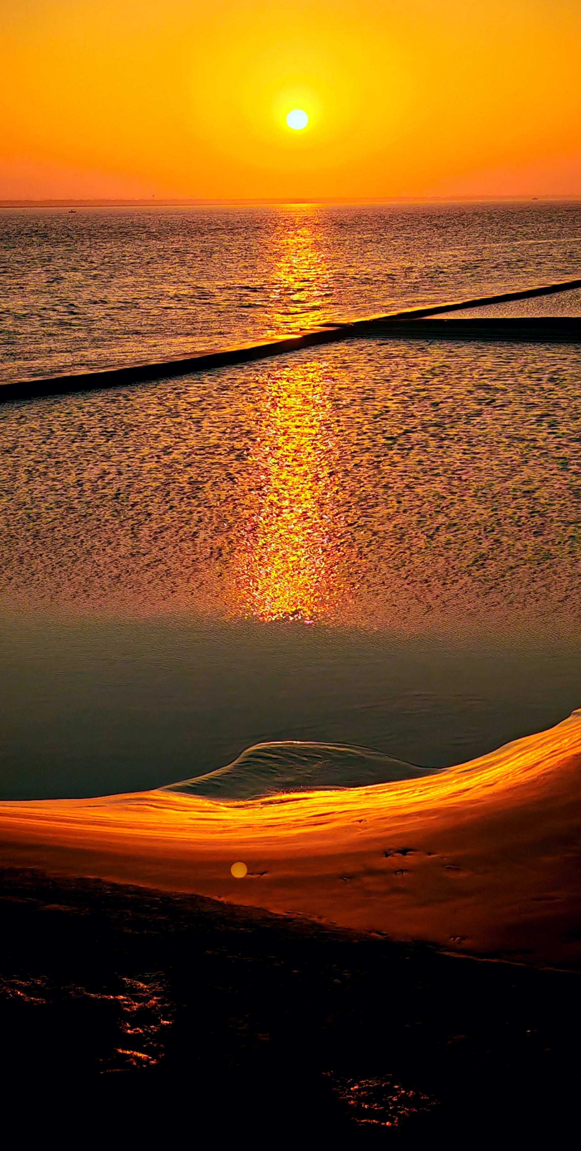 2025年12月15日,农历十月二十六,钱塘江小潮汛日。 下午四点多钟,冬日的钱塘江有了傍晚的味道,整个江面似乎准备归还给寂静的黄昏。 在北岸海宁市丁桥段,随着潮水缓缓东退,海塘塘脚边潮线渐低,赭褐色的滩涂不断显露,湿漉漉地映着天光。 光,是有脚步的。起初,钱塘江上的夕阳光线呈浅黄色,像一片被时间浸软的宣纸,温润而含蓄。随着太阳一点点沉坠,那抹浅黄化为了一片耀眼的金箔。将近五点钟,夕阳又将最后的炽烈酿成了酒红。 冬日的傍晚,夕阳在钱塘江上举行了一个盛大的色彩仪式,完成了一次无声的日落告白。差不多有半个小时,滩涂上的江沙与潮痕,也与天边霞光遥相呼应。 钱塘江,一条特别亮丽富贵的“金腰带”惊艳浙江海宁。