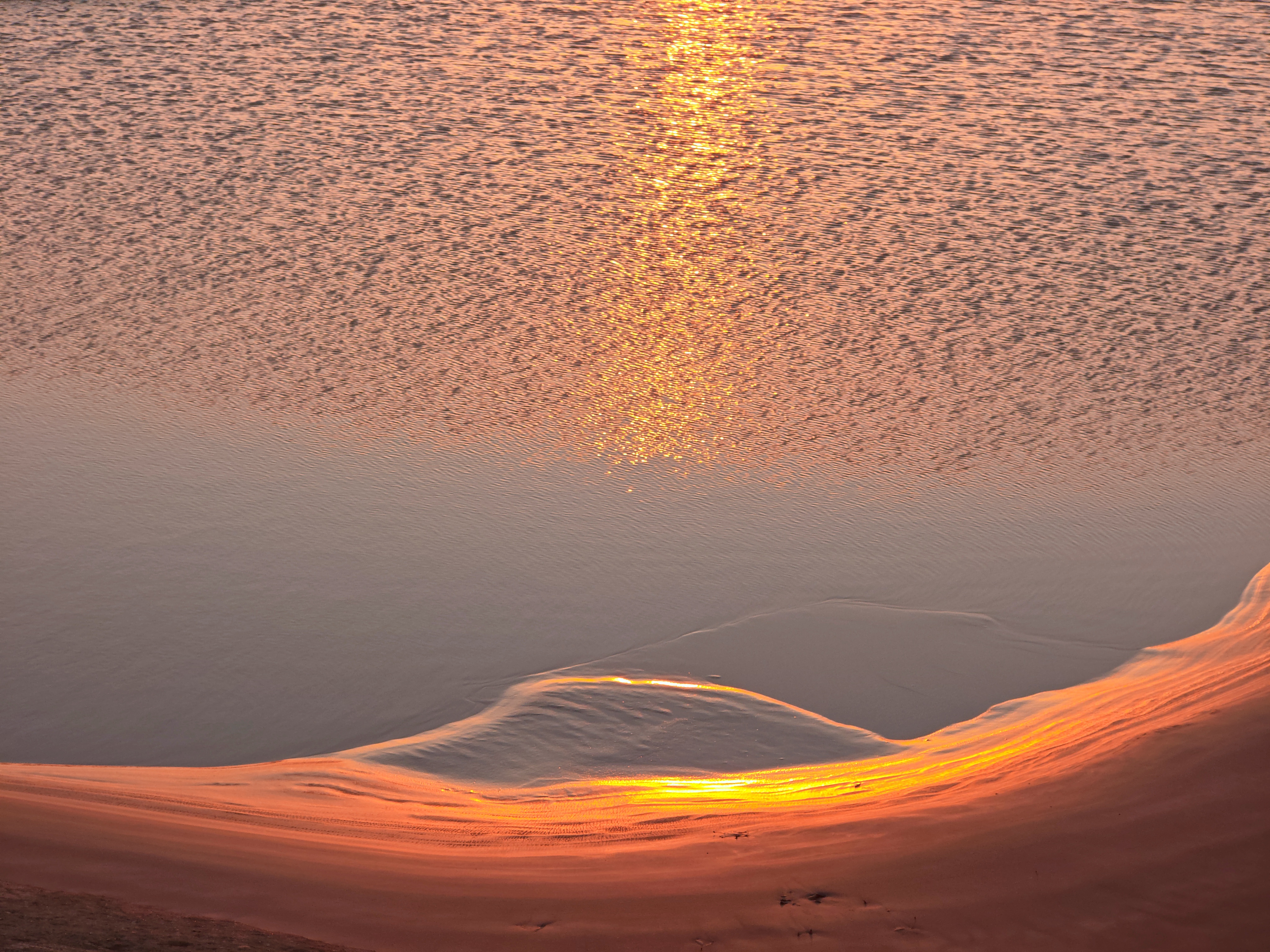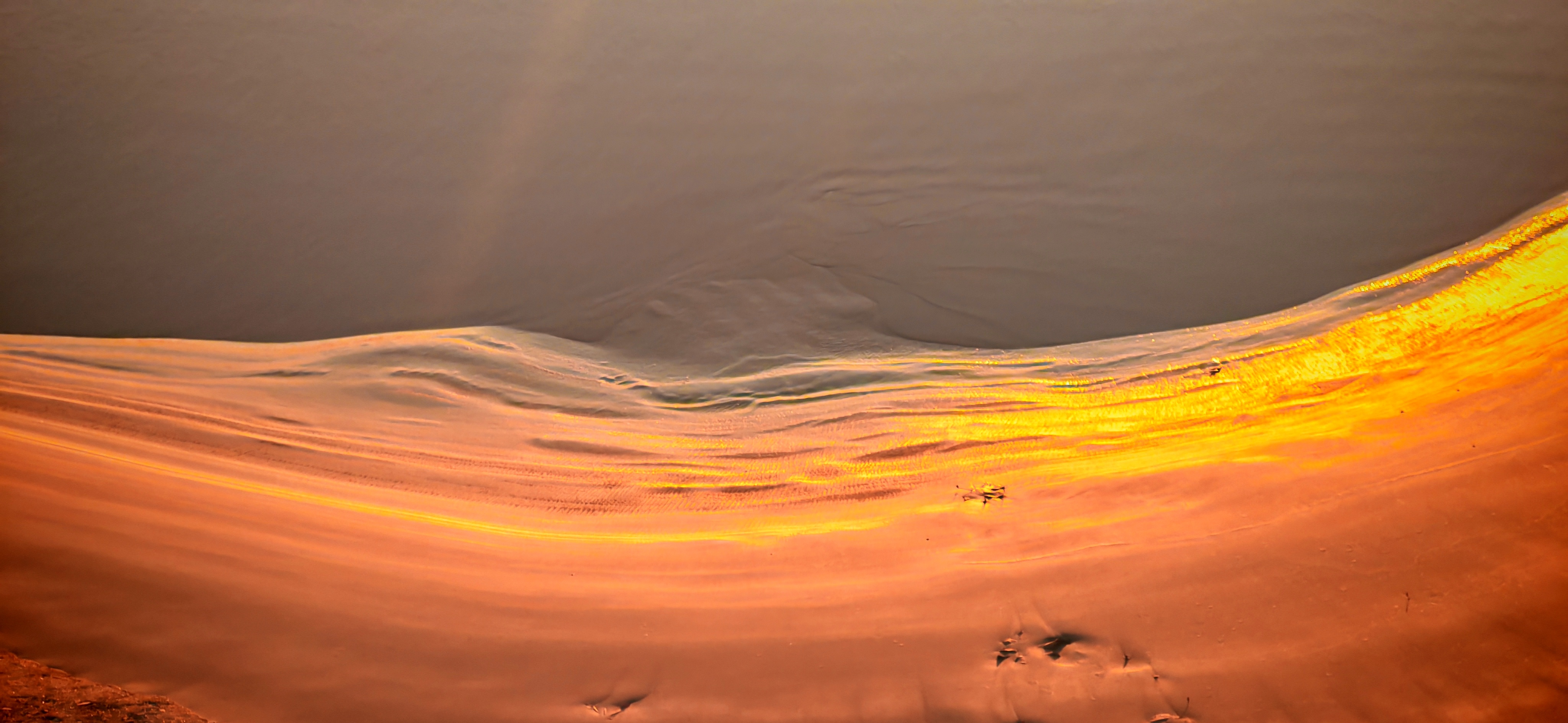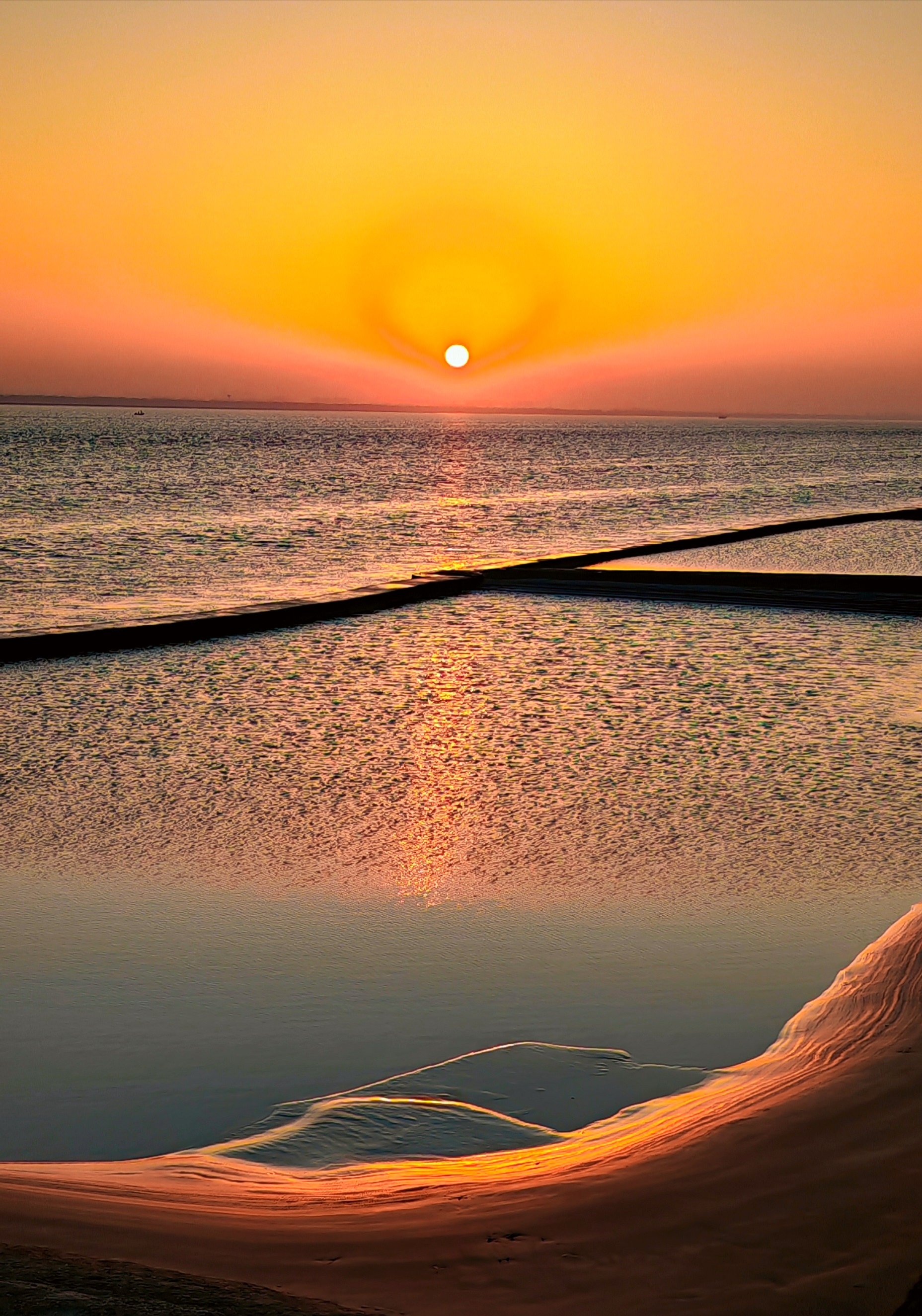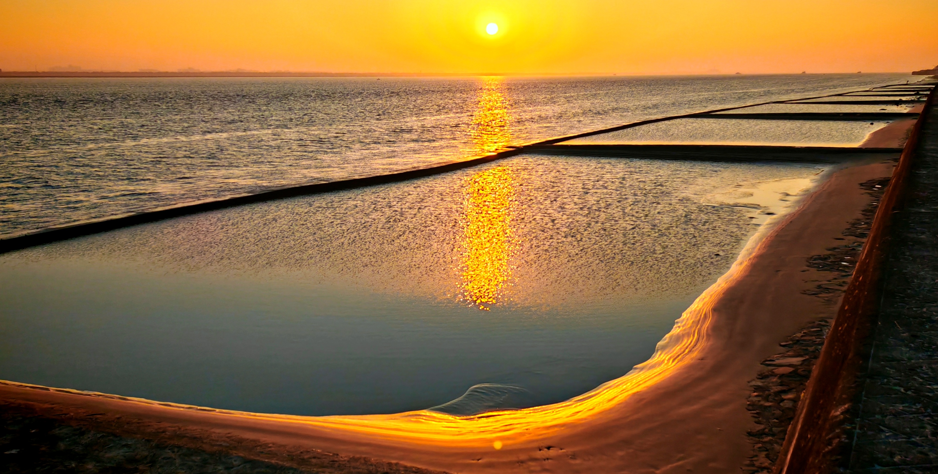 2025年12月15日,农历十月二十六,钱塘江小潮汛日。 下午四点多钟,冬日的钱塘江有了傍晚的味道,整个江面似乎准备归还给寂静的黄昏。 在北岸海宁市丁桥段,随着潮水缓缓东退,海塘塘脚边潮线渐低,赭褐色的滩涂不断显露,湿漉漉地映着天光。 光,是有脚步的。起初,钱塘江上的夕阳光线呈浅黄色,像一片被时间浸软的宣纸,温润而含蓄。随着太阳一点点沉坠,那抹浅黄化为了一片耀眼的金箔。将近五点钟,夕阳又将最后的炽烈酿成了酒红。 冬日的傍晚,夕阳在钱塘江上举行了一个盛大的色彩仪式,完成了一次无声的日落告白。差不多有半个小时,滩涂上的江沙与潮痕,也与天边霞光遥相呼应。 钱塘江,一条特别亮丽富贵的“金腰带”惊艳浙江海宁。
