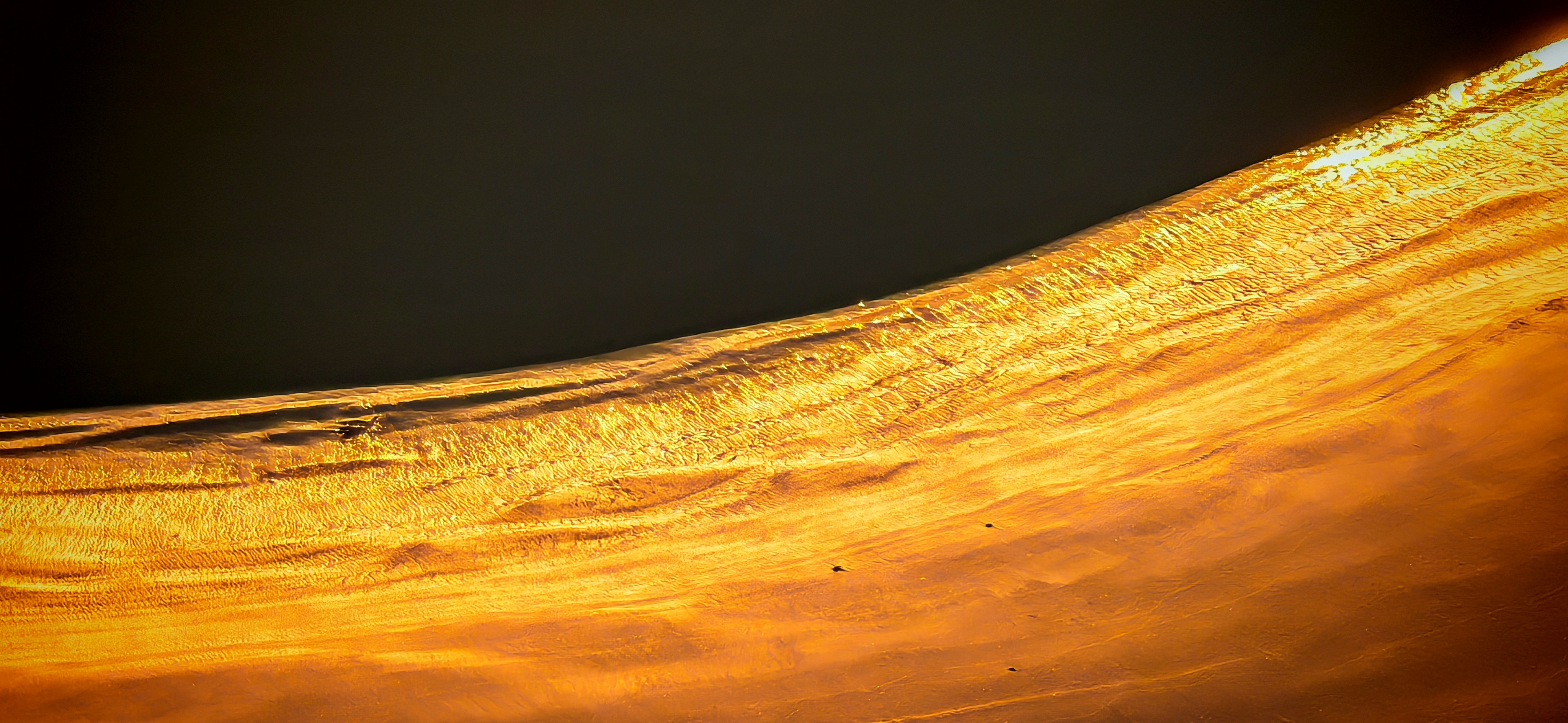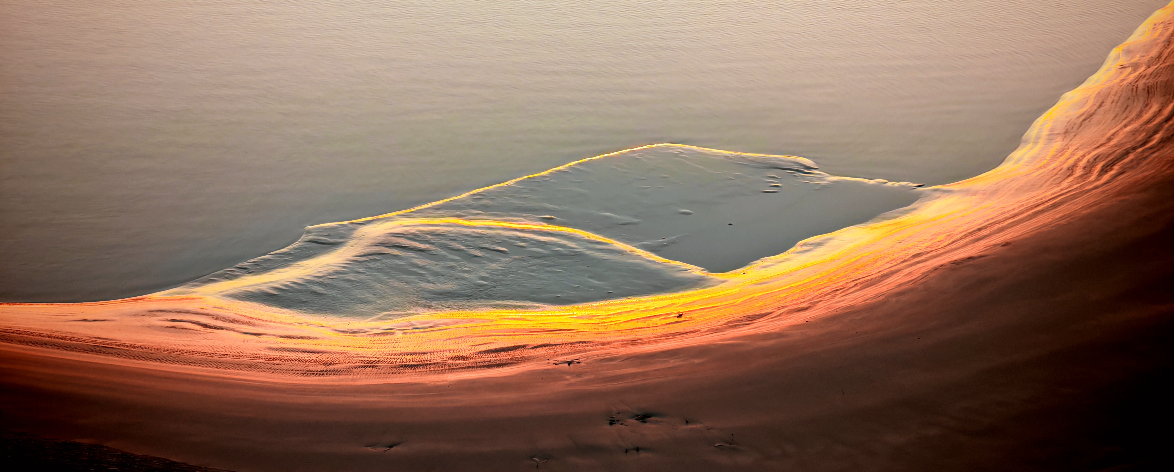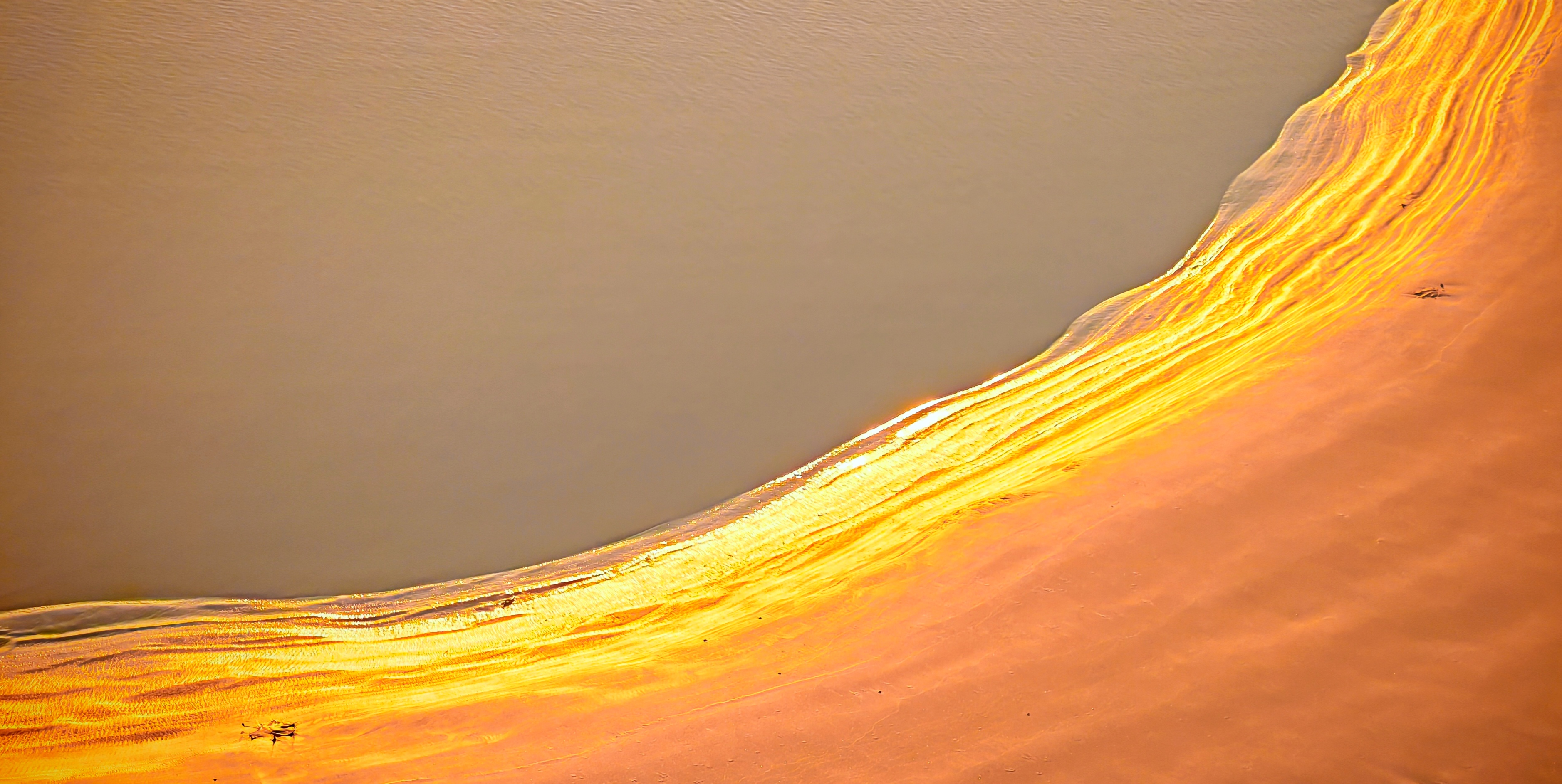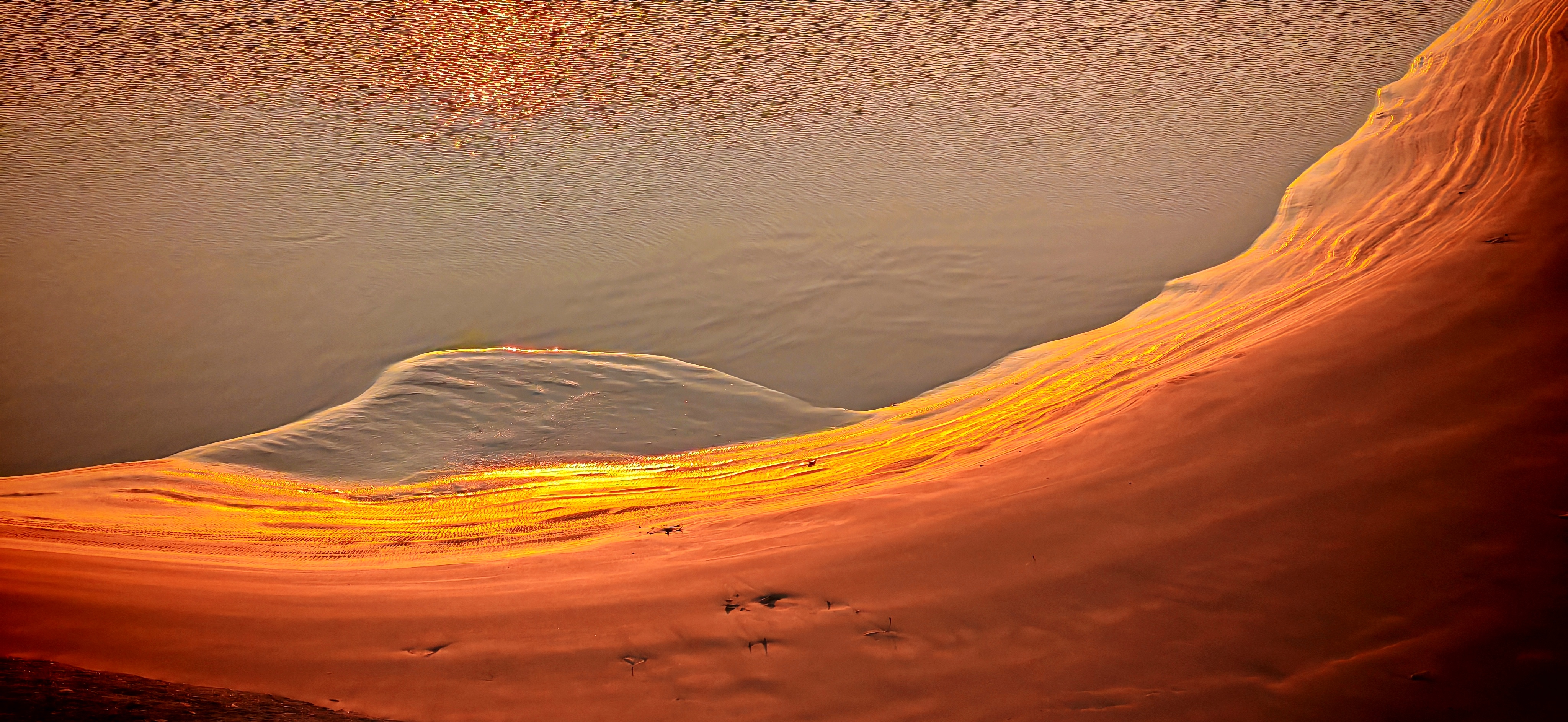 2025年12月15日,农历十月二十六,钱塘江小潮汛日。 下午四点多钟,冬日的钱塘江有了傍晚的味道,整个江面似乎准备归还给寂静的黄昏。 在北岸海宁市丁桥段,随着潮水缓缓东退,海塘塘脚边潮线渐低,赭褐色的滩涂不断显露,湿漉漉地映着天光。 光,是有脚步的。起初,钱塘江上的夕阳光线呈浅黄色,像一片被时间浸软的宣纸,温润而含蓄。随着太阳一点点沉坠,那抹浅黄化为了一片耀眼的金箔。将近五点钟,夕阳又将最后的炽烈酿成了酒红。 冬日的傍晚,夕阳在钱塘江上举行了一个盛大的色彩仪式,完成了一次无声的日落告白。差不多有半个小时,滩涂上的江沙与潮痕,也与天边霞光遥相呼应。 钱塘江,一条特别亮丽富贵的“金腰带”惊艳浙江海宁。
