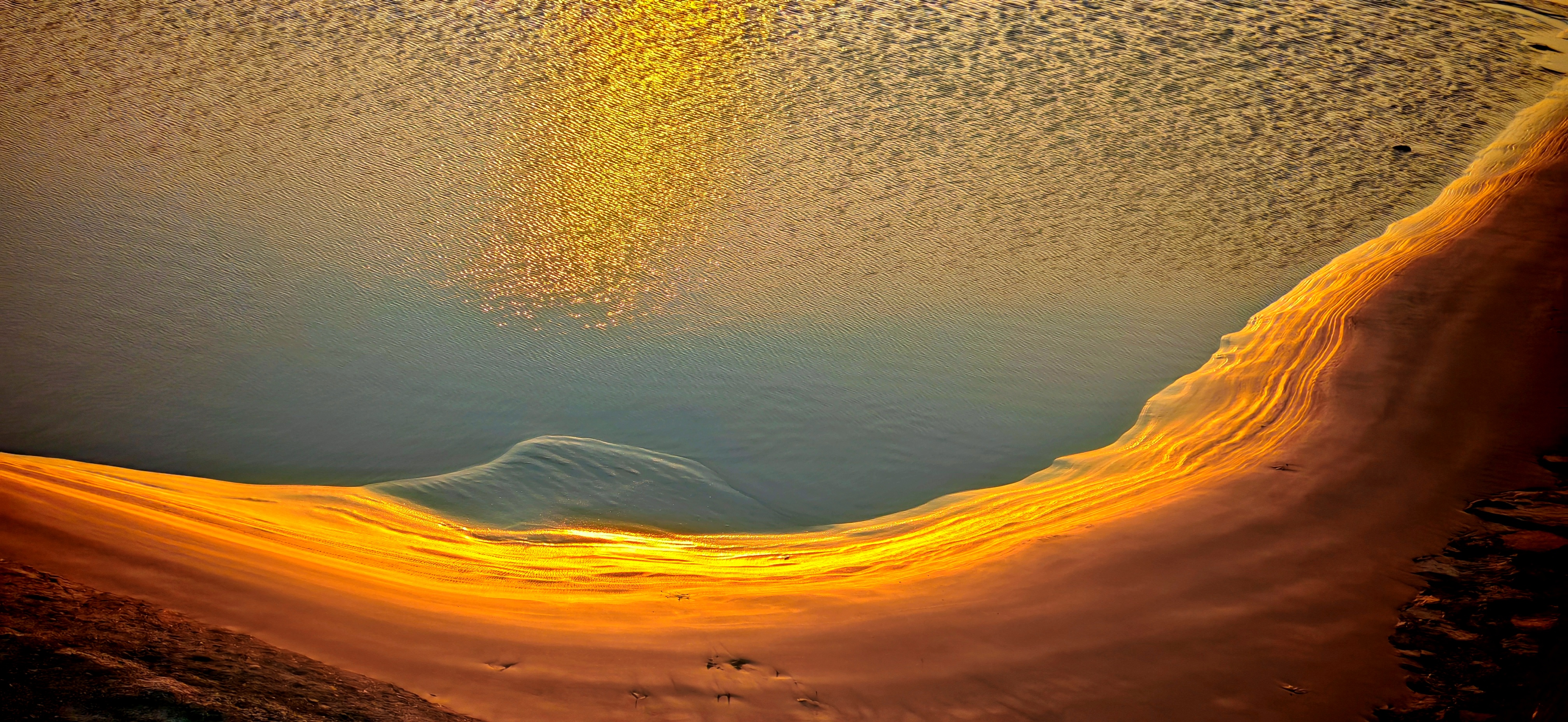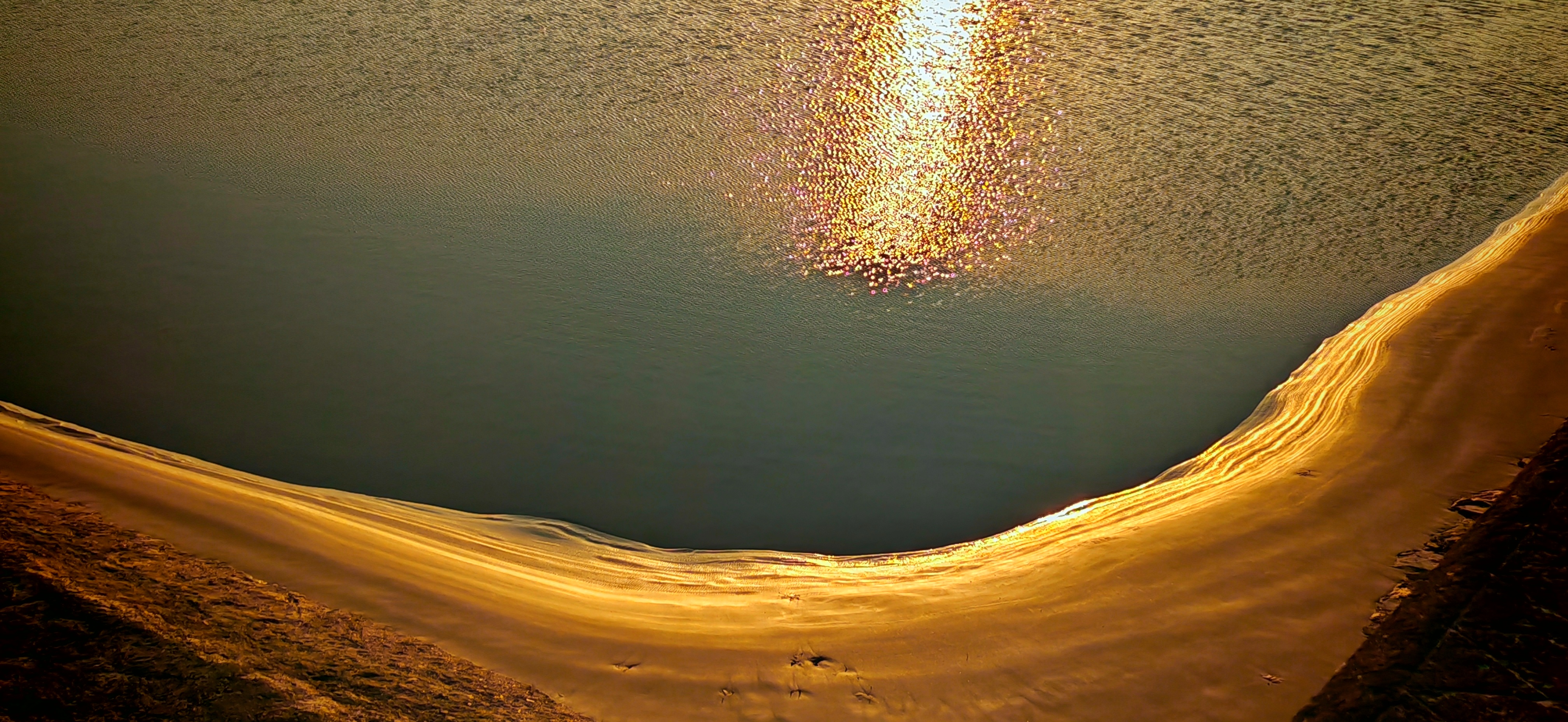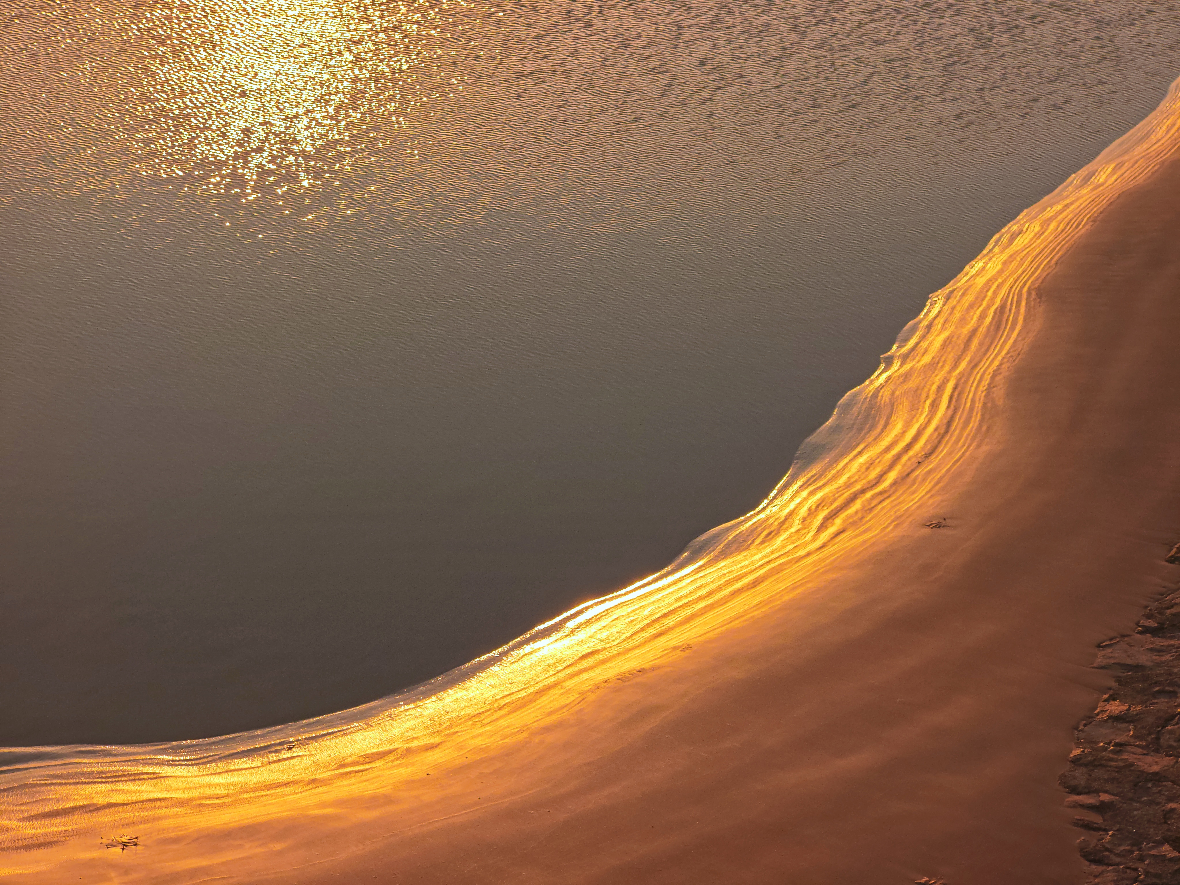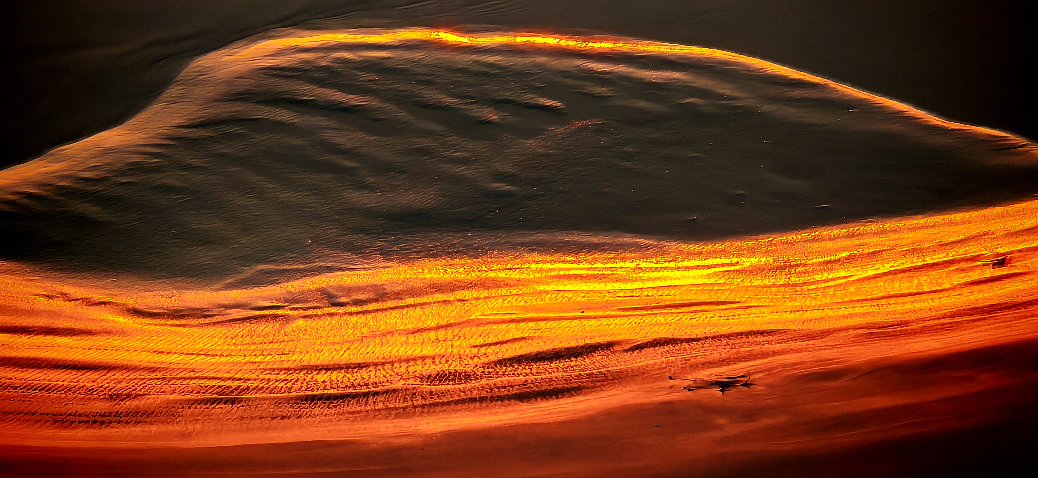 2025年12月15日,农历十月二十六,钱塘江小潮汛日。 下午四点多钟,冬日的钱塘江有了傍晚的味道,整个江面似乎准备归还给寂静的黄昏。 在北岸海宁市丁桥段,随着潮水缓缓东退,海塘塘脚边潮线渐低,赭褐色的滩涂不断显露,湿漉漉地映着天光。 光,是有脚步的。起初,钱塘江上的夕阳光线呈浅黄色,像一片被时间浸软的宣纸,温润而含蓄。随着太阳一点点沉坠,那抹浅黄化为了一片耀眼的金箔。将近五点钟,夕阳又将最后的炽烈酿成了酒红。 冬日的傍晚,夕阳在钱塘江上举行了一个盛大的色彩仪式,完成了一次无声的日落告白。差不多有半个小时,滩涂上的江沙与潮痕,也与天边霞光遥相呼应。 钱塘江,一条特别亮丽富贵的“金腰带”惊艳浙江海宁。
