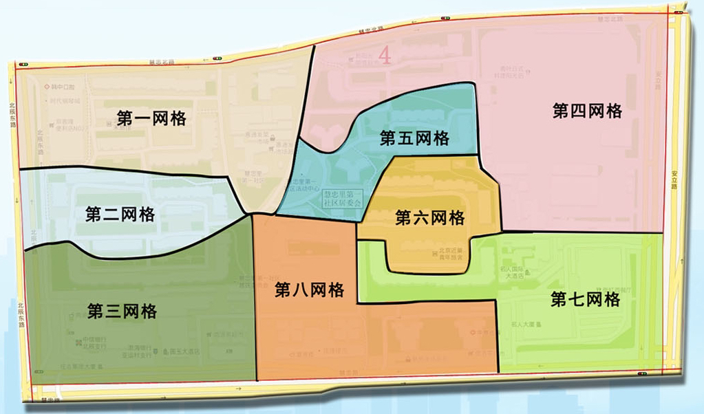 慧忠里第一社区位于大屯街道一轴三带一核心的宜居生活带,辖区总面积0.24平方公里,共有居民楼29栋,住户3116户,常住人口7756人。
