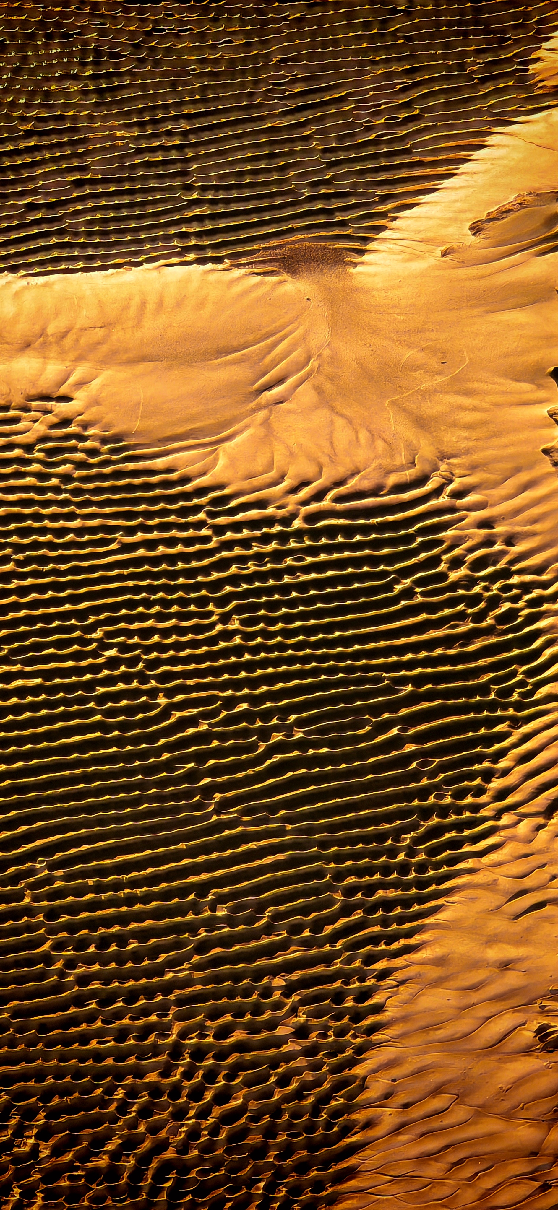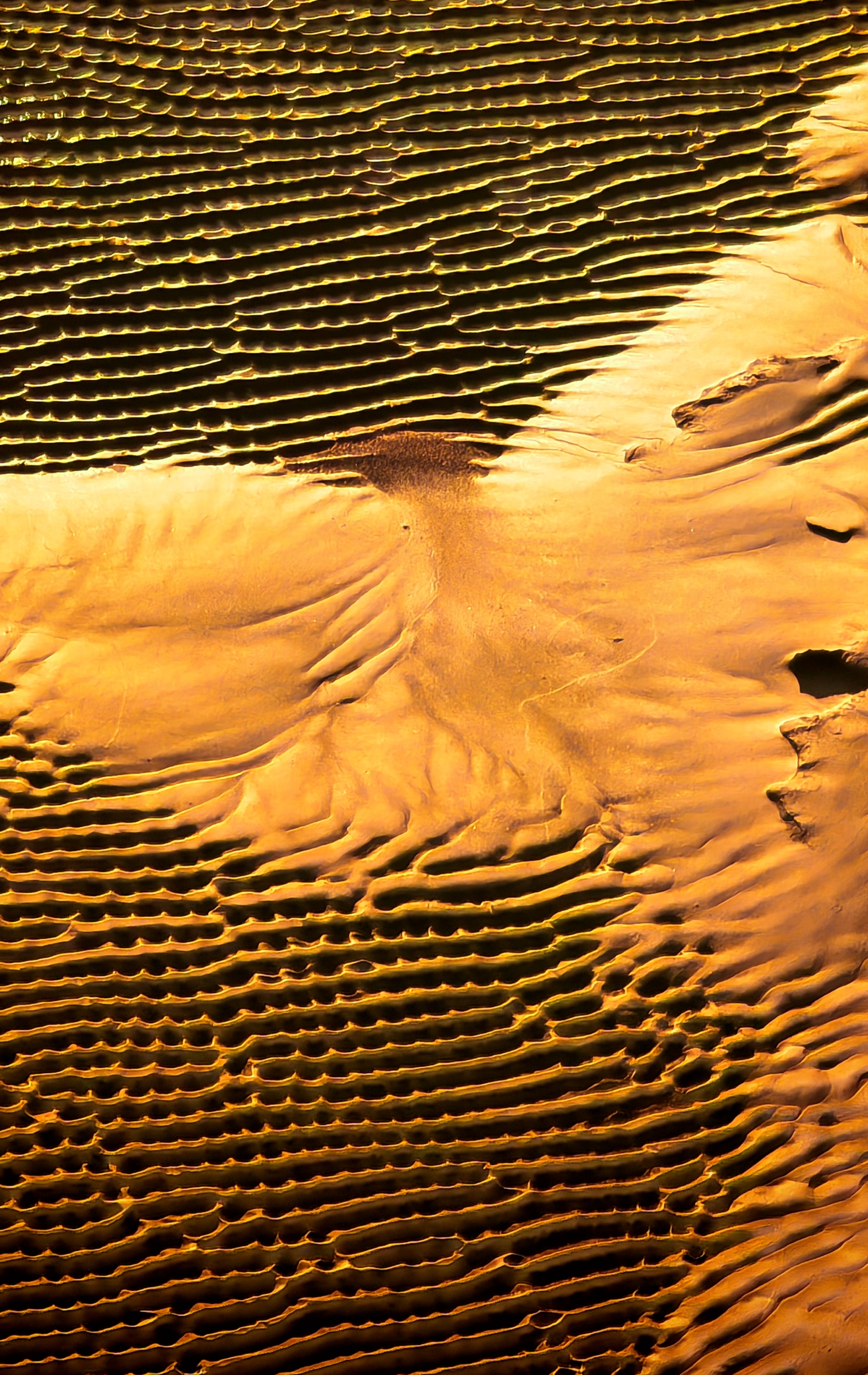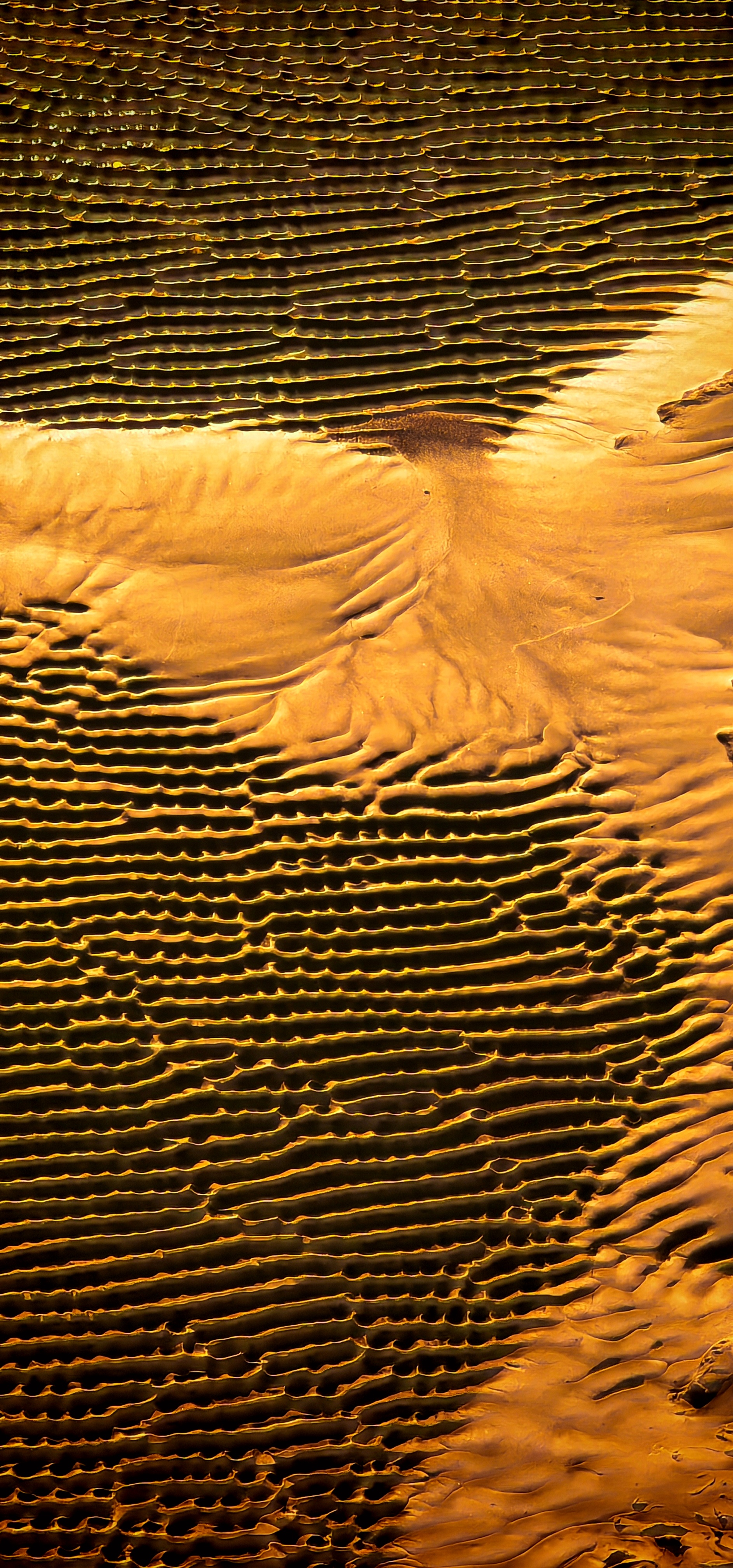 2025年12月15日,夕阳映照下的钱塘江北岸丁桥段近海塘滩涂上,退潮后淤积的沙泥幻化为一只振翅飞翔的“飞鸟”,载着这惊鸿一现的会飞行的黄昏与不会飞行的时光,惟妙惟肖,美轮美奂。