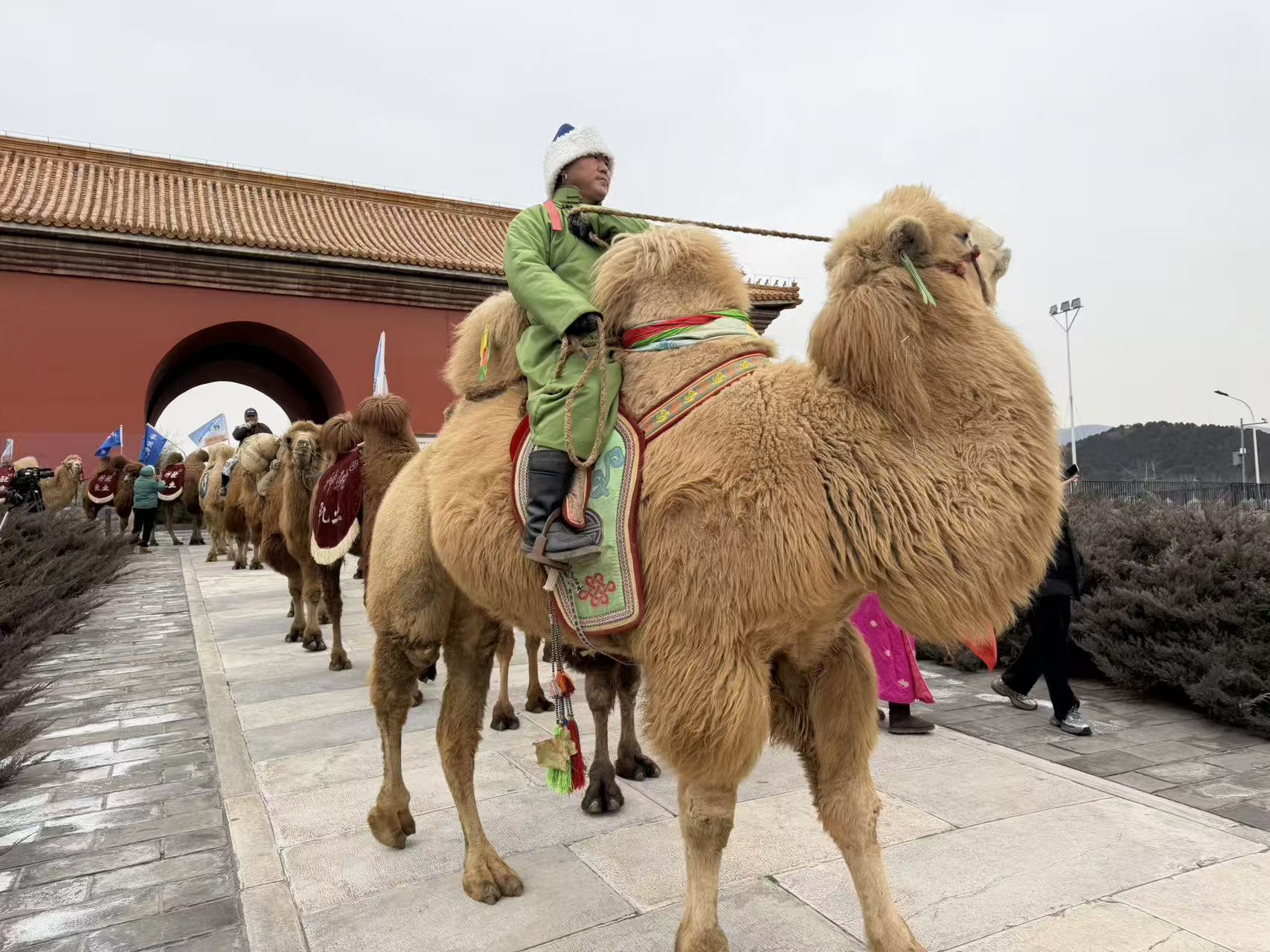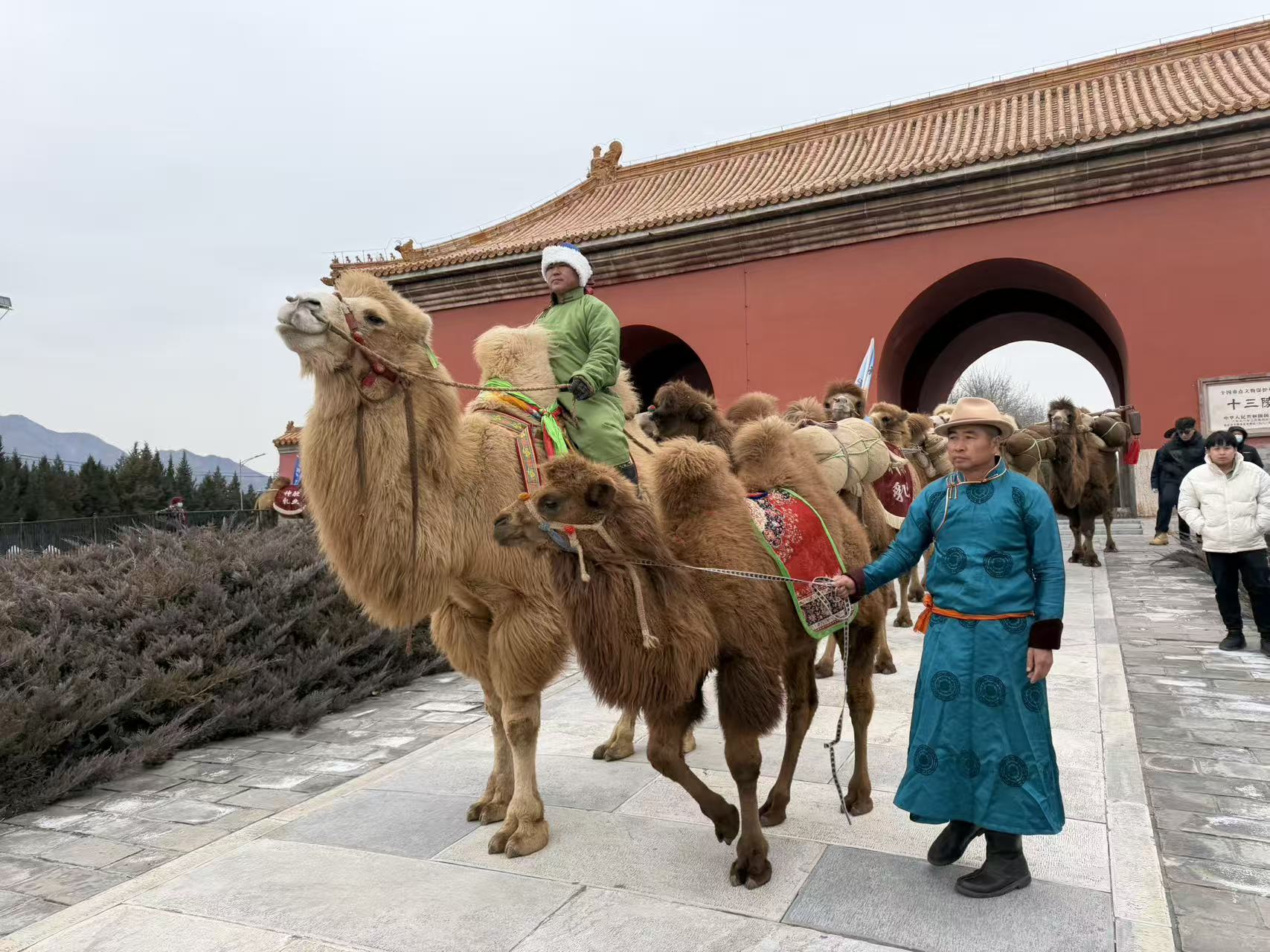 近日,“神驼万里行”活动走进明十三陵神路景区,14头来自“中国驼奶之乡”内蒙古自治区阿拉善盟阿拉善右旗的骆驼,迈着稳健的步伐从大宫门出发,沿古道缓缓走向神路景区,民族文化与皇家文化在此交汇碰撞,为冬日的十三陵注入了别样活力。