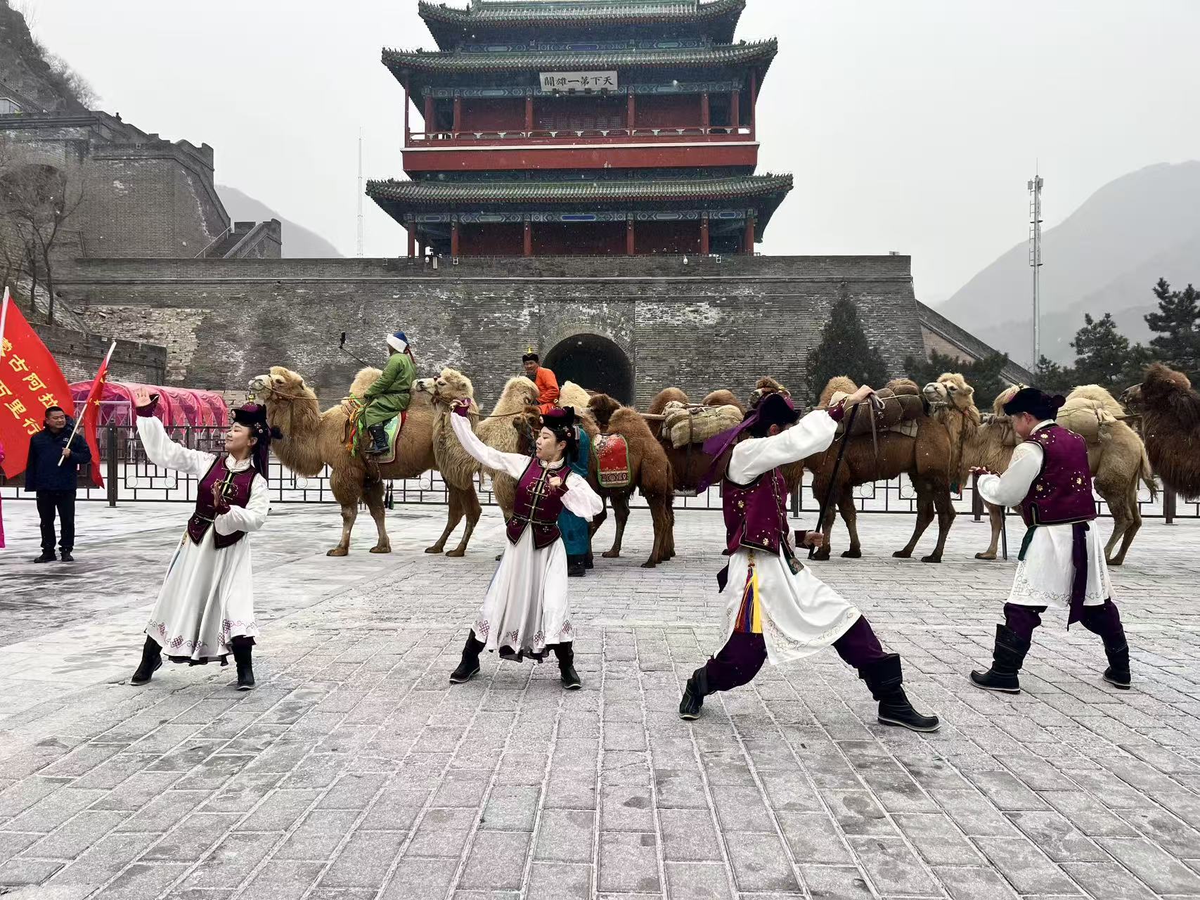 当天下午,阿拉善右旗乌兰牧骑宣传演出还走进居庸关长城,带来了以“歌游内蒙古 神驼万里行”为主题的特色表演。演出囊括陶布秀尔与萨吾尔登《非遗之魅》、马头琴齐奏《黑木日》《万马奔腾》、长调《高大的枣红马》等经典蒙古族节目,更有呼麦、歌舞《苍天般的阿拉善》等特色表演轮番上演,将蒙古族的非遗魅力与草原风情展现得淋漓尽致,让游客在居庸关长城脚下,沉浸式感受草原文化与长城文化的交融之美。