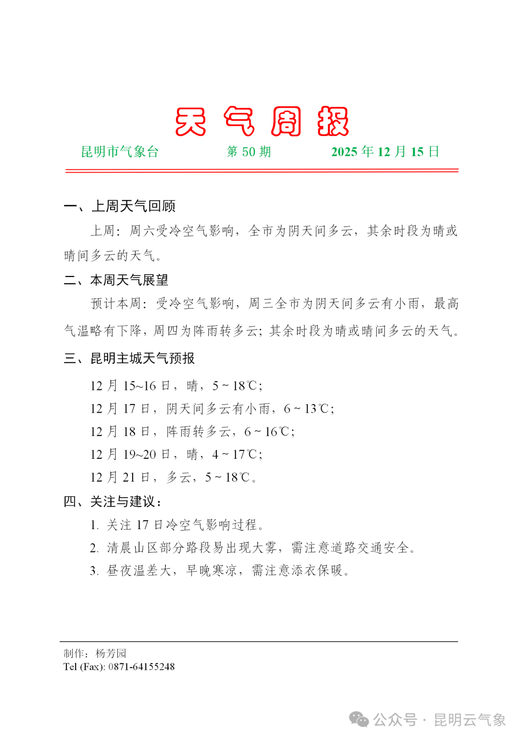 昆明市气象局副局长赵元茂介绍,根据现有气象资料分析,2025年冬季(2025年12月至2026年2月)昆明全市气温将偏高0.5—1.0℃,但阶段性冷空气活动频繁,预计2025年12月底至2026年2月中旬将出现3至4轮较强冷空气天气过程。2026年春季,全市降水较常年偏少,气温则维持正常至偏高水平。