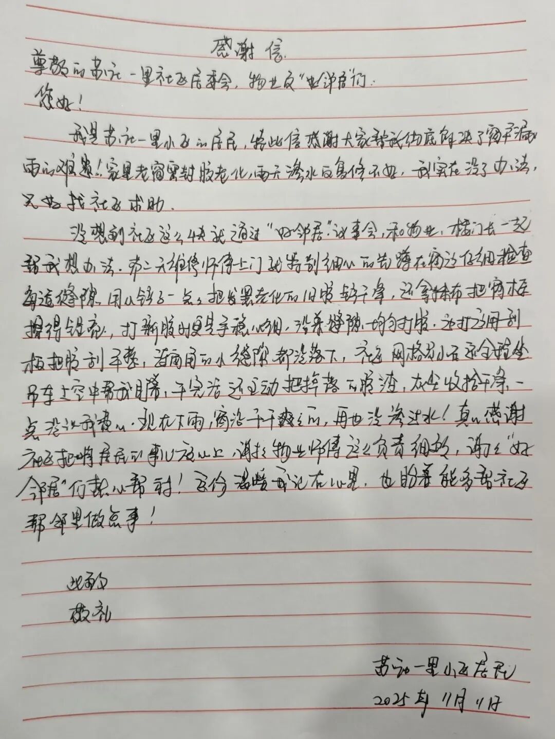 几天后,王女士将一封手写感谢信送到社区表达谢意,“感谢社区、感谢我们的‘好邻居’!”王女士开心地说道。