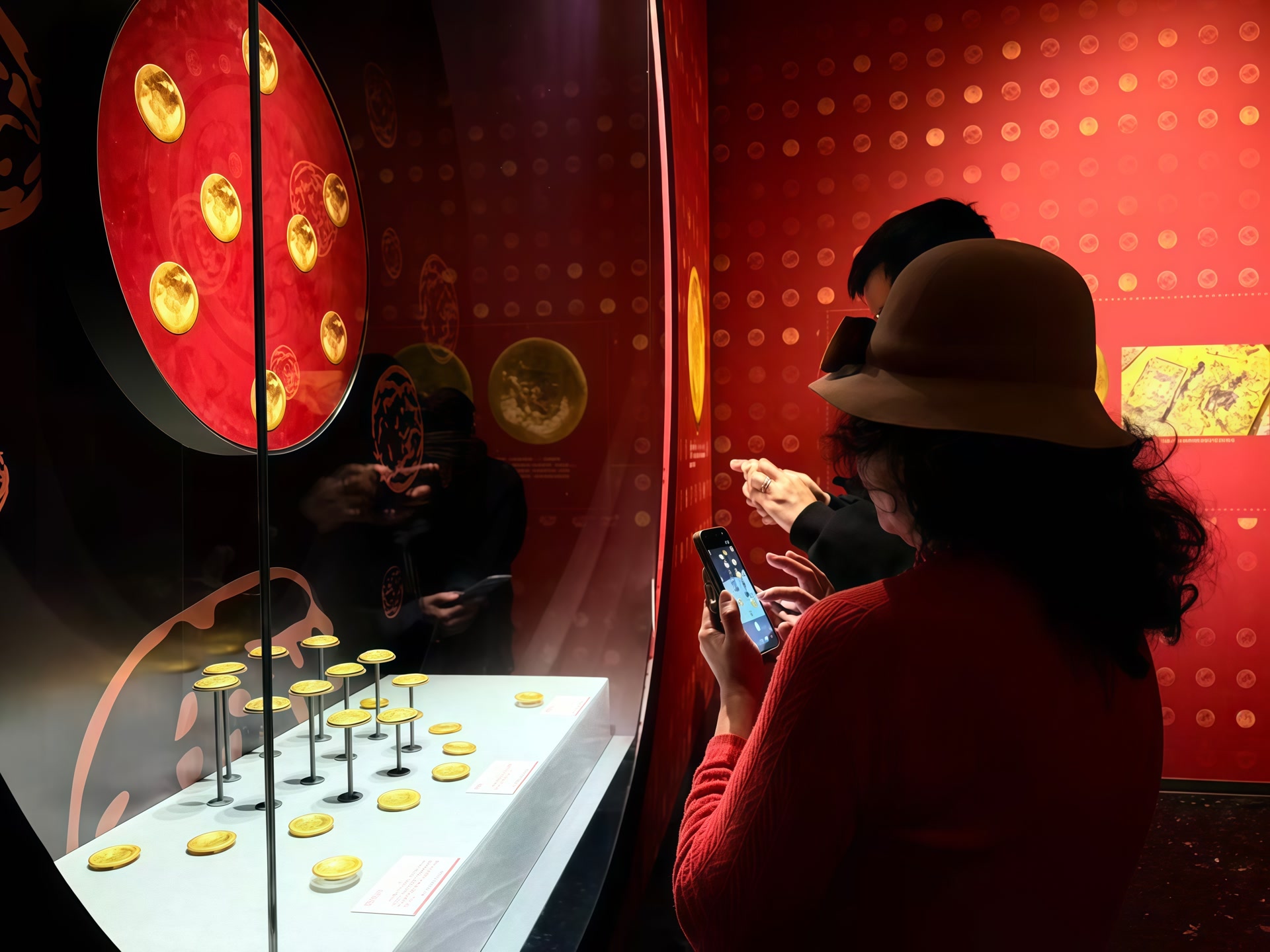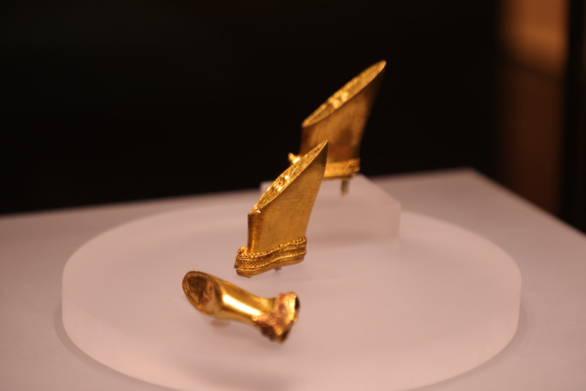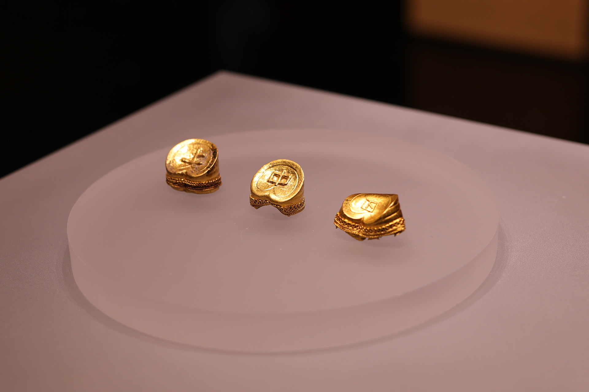 展厅内“金锡之贡”单元尤为亮眼,纯度高达99%的褭蹏金(马蹄金)、麟趾金、饼金整齐陈列,底部“上”“中”“下”的铭文清晰可辨,精湛的花丝镶嵌工艺尽显汉代工匠技艺的高超。