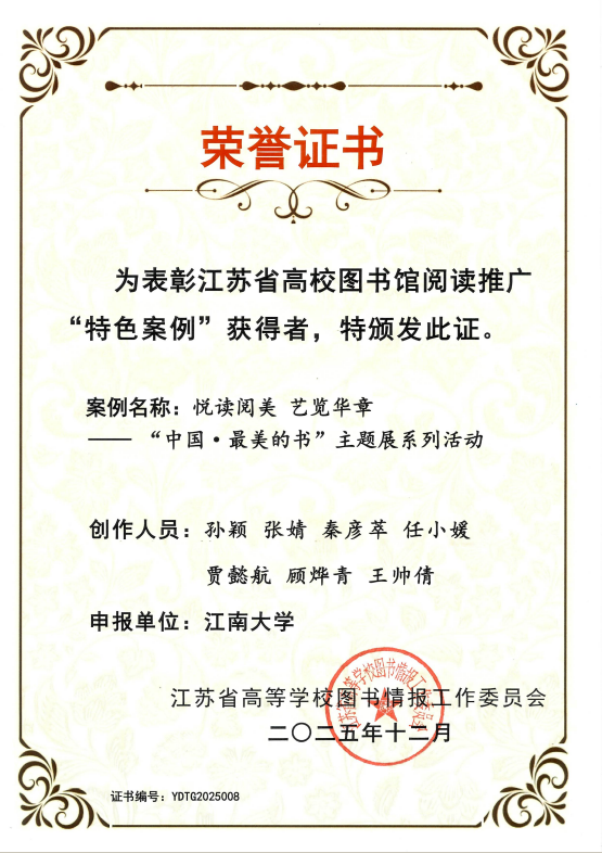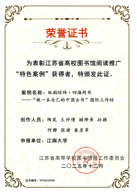 12月11日下午,2025年江苏省高校图书馆阅读推广精品案例分享会暨颁证仪式在镇江隆重举行。我校图书馆报送的《悦读阅美·艺览华章——“中国·最美的书”主题展系列活动》与《纸韵经纬·四海同书——“做一本自己的中国古书”国际工作坊》,荣获“特色案例奖”称号。