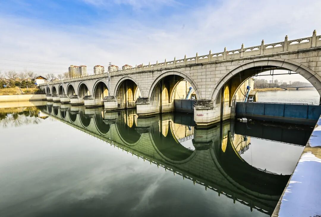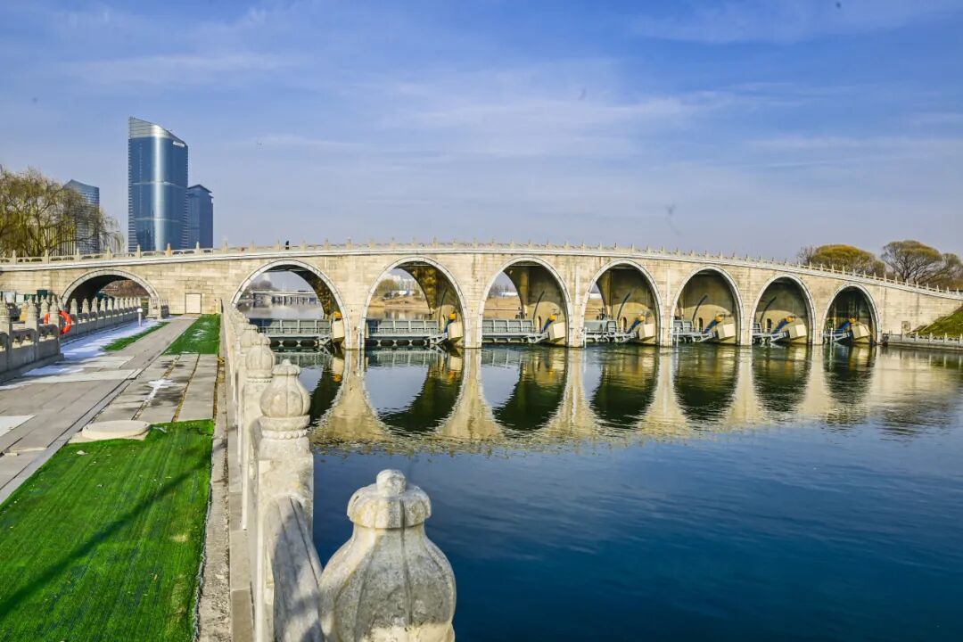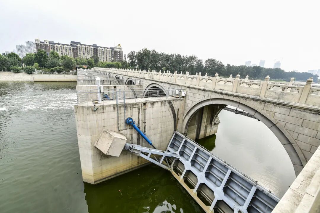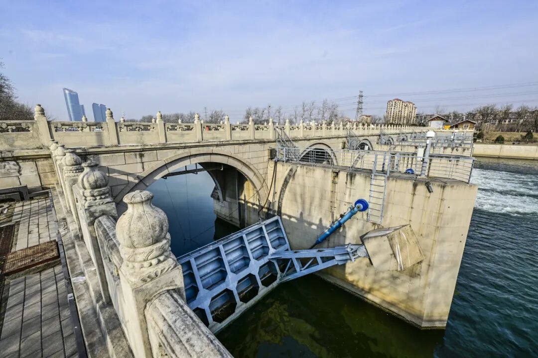 在千荷泻露桥上向北望去,大光楼边上的那座古朴石桥便是北关分洪枢纽的新拦河闸。曲一介绍,新拦河闸采用闸桥合一设计,在设计之初,就充分考虑到与历史文化相结合,借鉴颐和园十七孔桥的设计思路,采用中国拱形多孔桥的造桥艺术修建。闸室共7孔,将闸门隐于桥下椭圆形的桥洞中,远看是桥,近看为闸,避免了以往启闭机式水闸工作桥过高阻挡视线的不足。由于建设在历史上的石坝码头处,所以这个桥又叫“石坝桥”。为减少工程痕迹,控制闸门的液压结构均通过地下廊道进入大光楼。同时,在拦河闸桥西还增设了一个船闸,未来游船可经此通行,直观见证大运河京冀段水道的复苏。